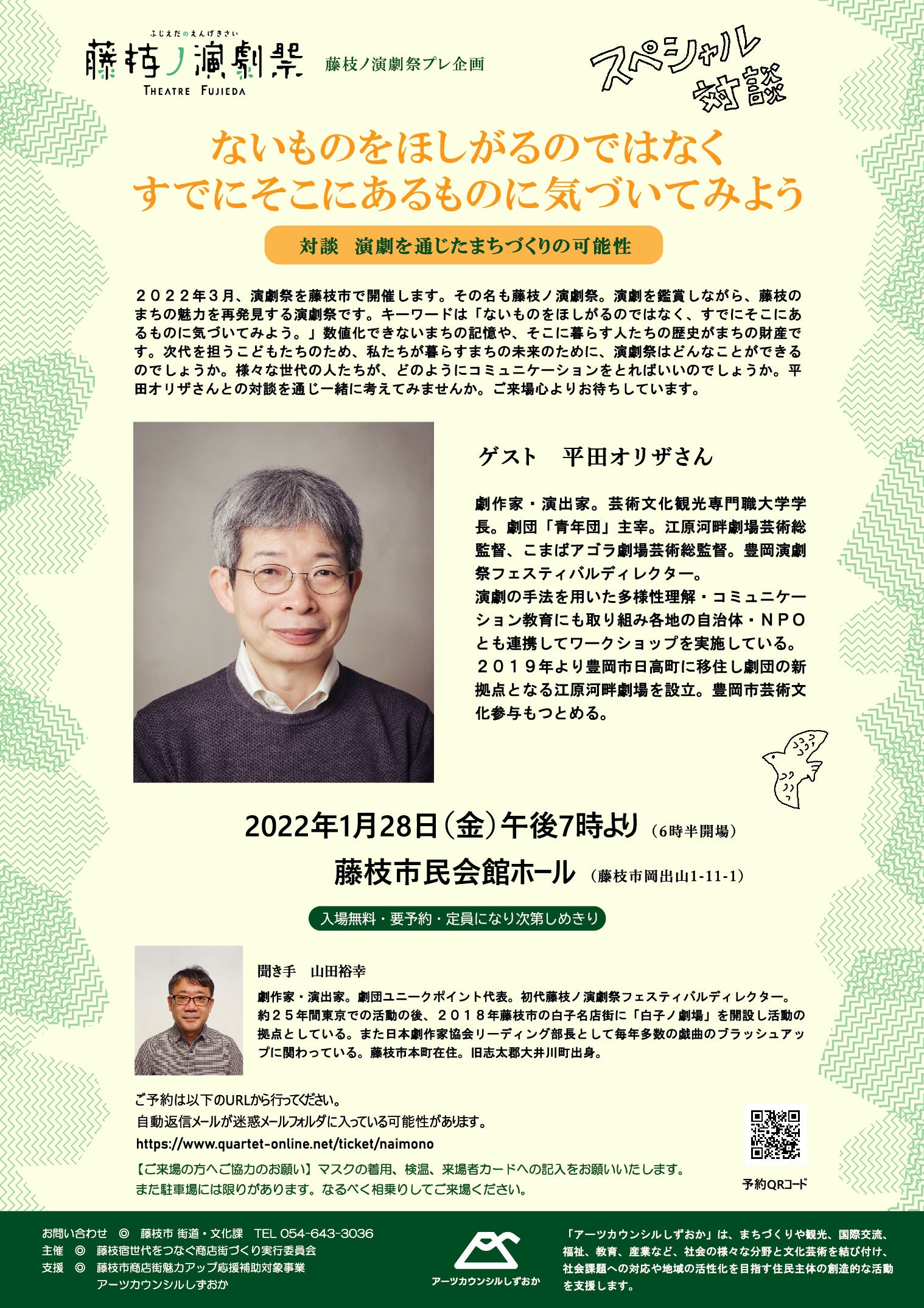藤枝ノ演劇祭プレ企画「対談 演劇を通じたまちづくりの可能性」は、2022年3月5日、6日の2日間、初開催となる演劇祭を藤枝市の旧東海道エリアを中心に実施。