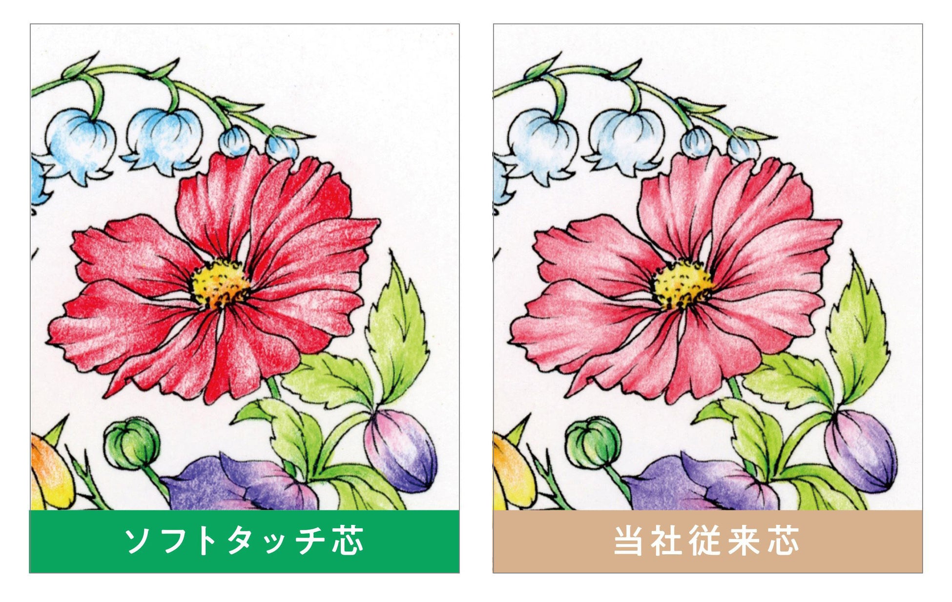 ひと塗りで約30%濃く塗れる「ソフトタッチ芯」を新たに採用しました。(当社従来品比「赤」等の平均値)