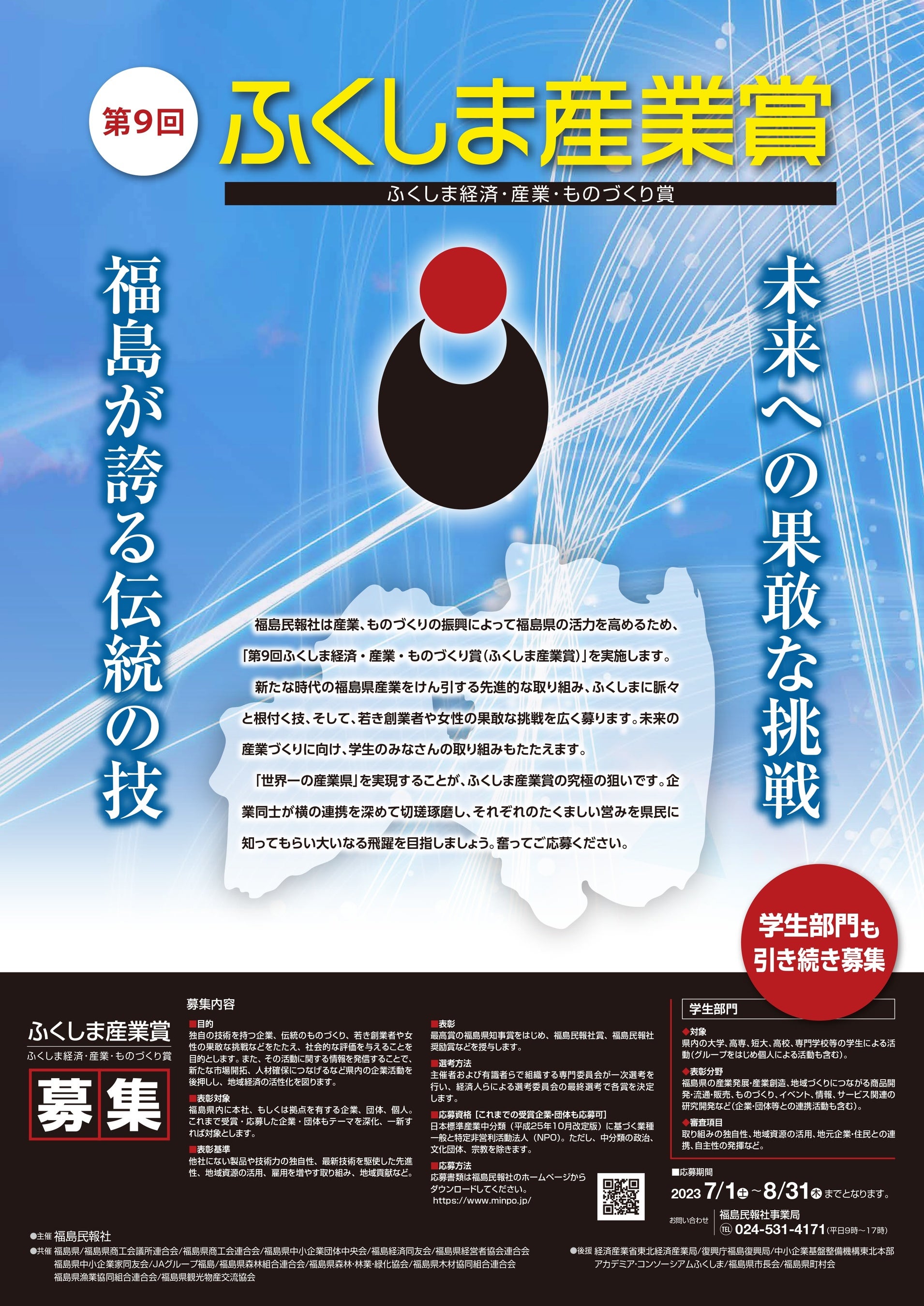 福島民報社は優れた事業を展開する福島県内の企業・団体・個人を表彰する「第9回ふくしま経済・産業・ものづくり賞(ふくしま産業賞)」の募集を始めました。