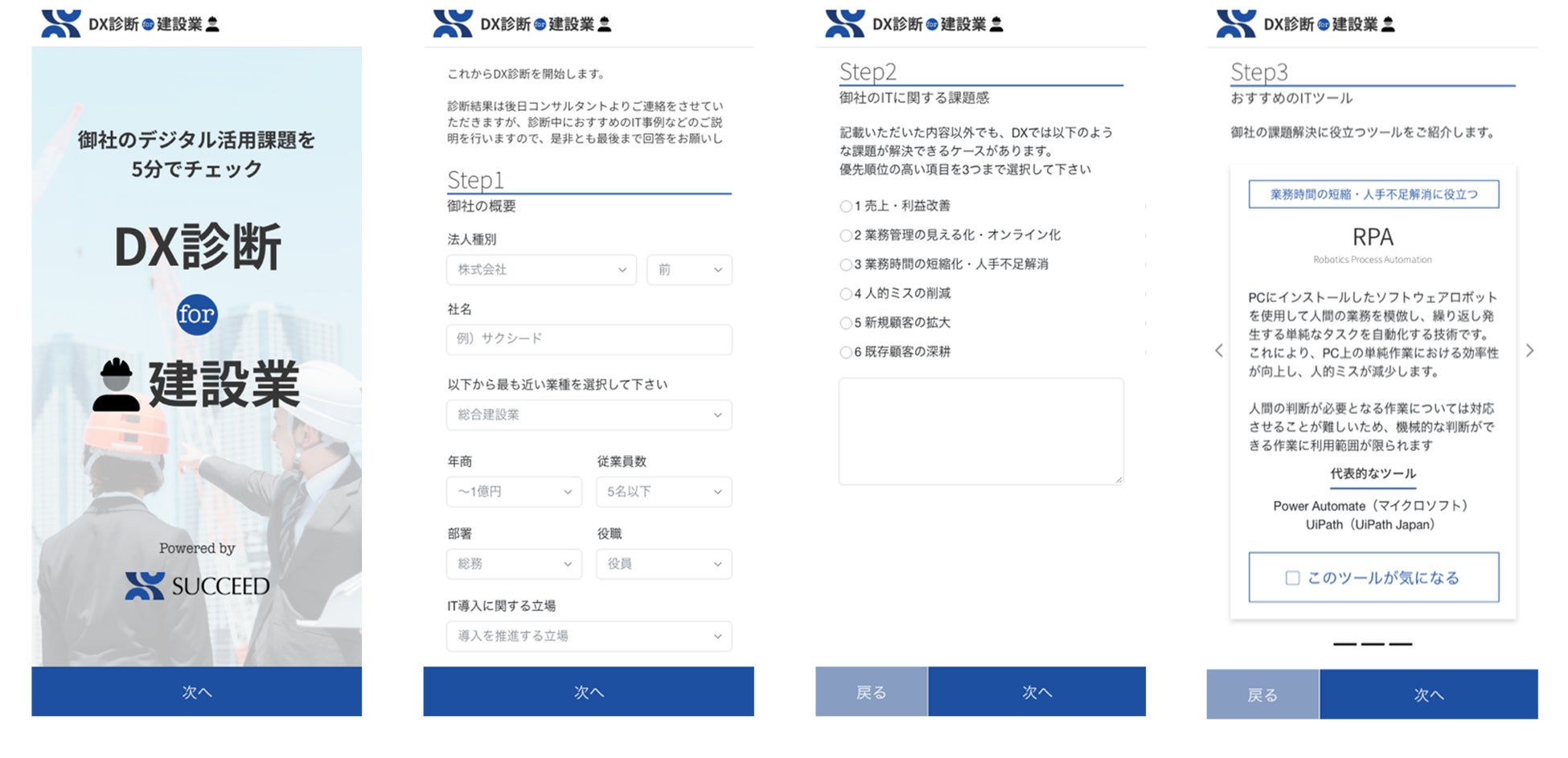 中小企業の経営者は、サクシードwebサイトより「DX診断」サービスをご利用いただけます。サービスのご利用後、弊社専門家が個別に連絡を取り、診断結果に基づく具体的なデジタル利活用の方向性についてご提案いたします。