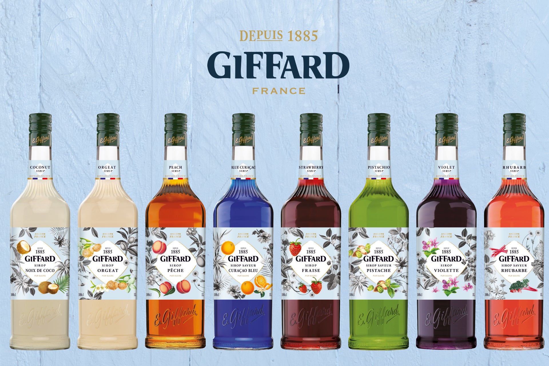 創業137年を誇るジファールは、「味こそが最高の素材」という哲学に基づいた、高品質なリキュール&シロップで知られ、世界85か国のバーテンダーやバリスタから信頼のブランドとして支持されてきました。日本でもこの春からシロップのシリーズの展開をスタート。第2弾となる今回は、「ココナッツ」「オルジェ」「ピーチ」「ブルーキュラソー」「バイオレット」「ピスタチオ」「ストロベリー」「ルバーブ」がラインナップに加わります。