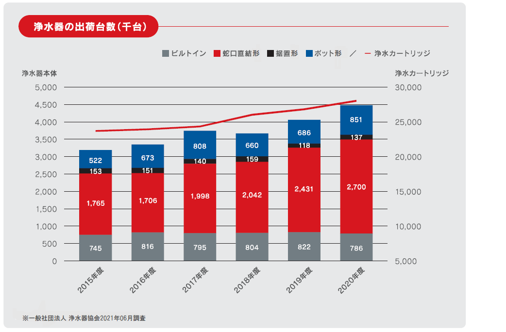 一般社団法人 浄水器協会の2021年6月の調査※1によると、浄水器の出荷台数は、2015年度より年々増加傾向にあります。特に2020年度は、コロナ禍の巣ごもり需要も追い風となり、蛇口直結型モデルとポット型モデルの出荷が急伸しています。外出自粛で自宅での水道水利用の機会が増えたことで、水の安心やおいしさへの関心が高まっており、浄水器市場のさらなる拡大が見込めます。