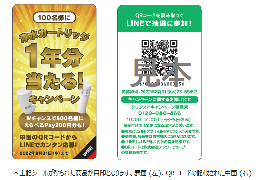 対象商品に貼付されているキャンペーンシールに記載されたQRコード*¹ からクリンスイの公式LINEにアクセスして、抽選ページよりご参加ください。参加後、クリンスイ公式LINE*² のアカウント内でシリアルコードを送信していただくと、抽選結果の返信がトークルームに届きます。