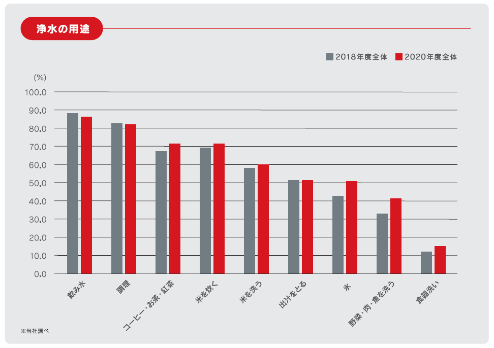 また、コロナ禍によるステイホームや外食の機会の減少により、 自炊のニーズが高まっており、浄水の料理への活用も増えています。当社が実施した「2021年浄水器市場に関する調査」※2によると、浄水の用途として、やはり「飲み水」や「調理」が多いですが、前回の調査と比べて、料理の「下ごしらえ」にも使う方が増えています。「米を炊く」や「氷」など、直接口に入れるものへの利用だけでなく、「米を洗う」「野菜・肉・魚を洗う」などの下ごしらえにも浄水を利用する方が増えています。料理の下ごしらえへの活用には、蛇口直結型モデルが便利です。