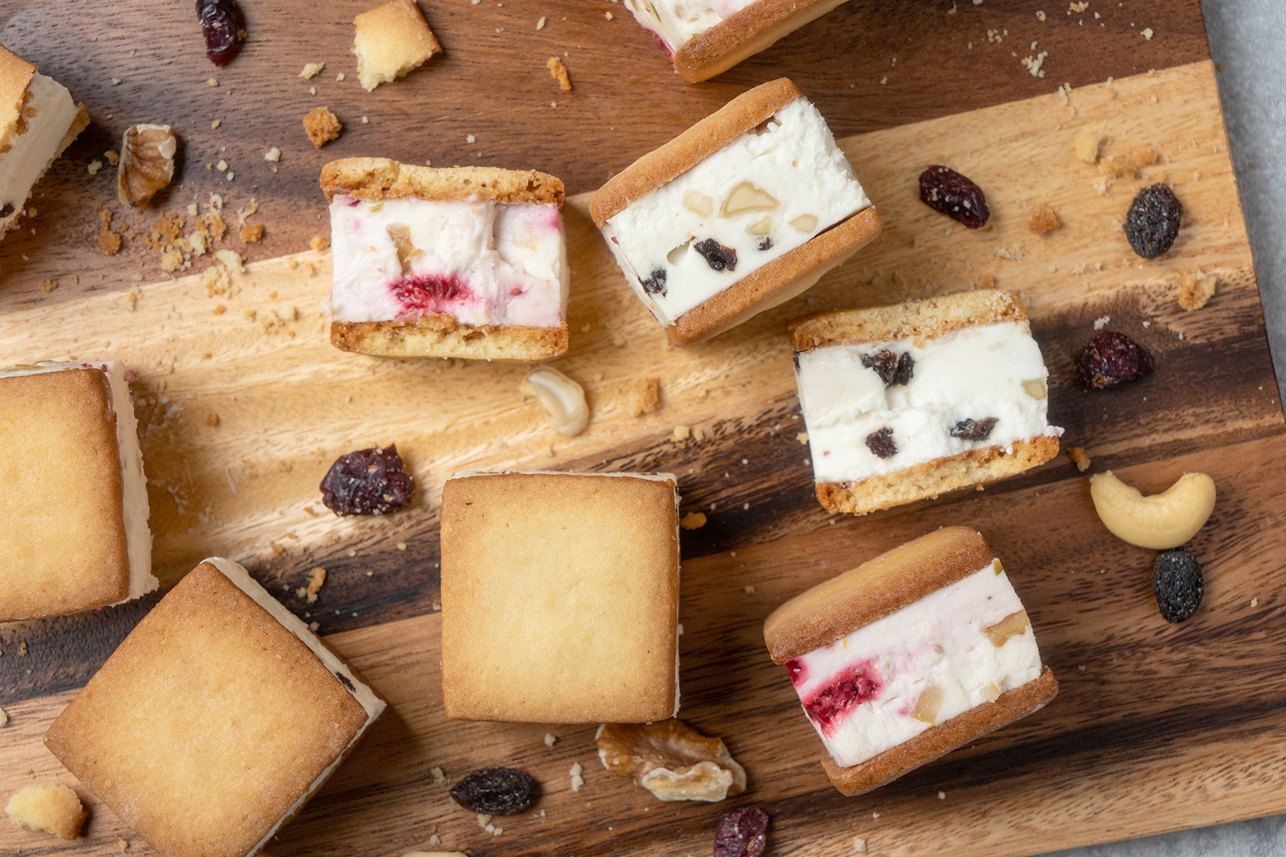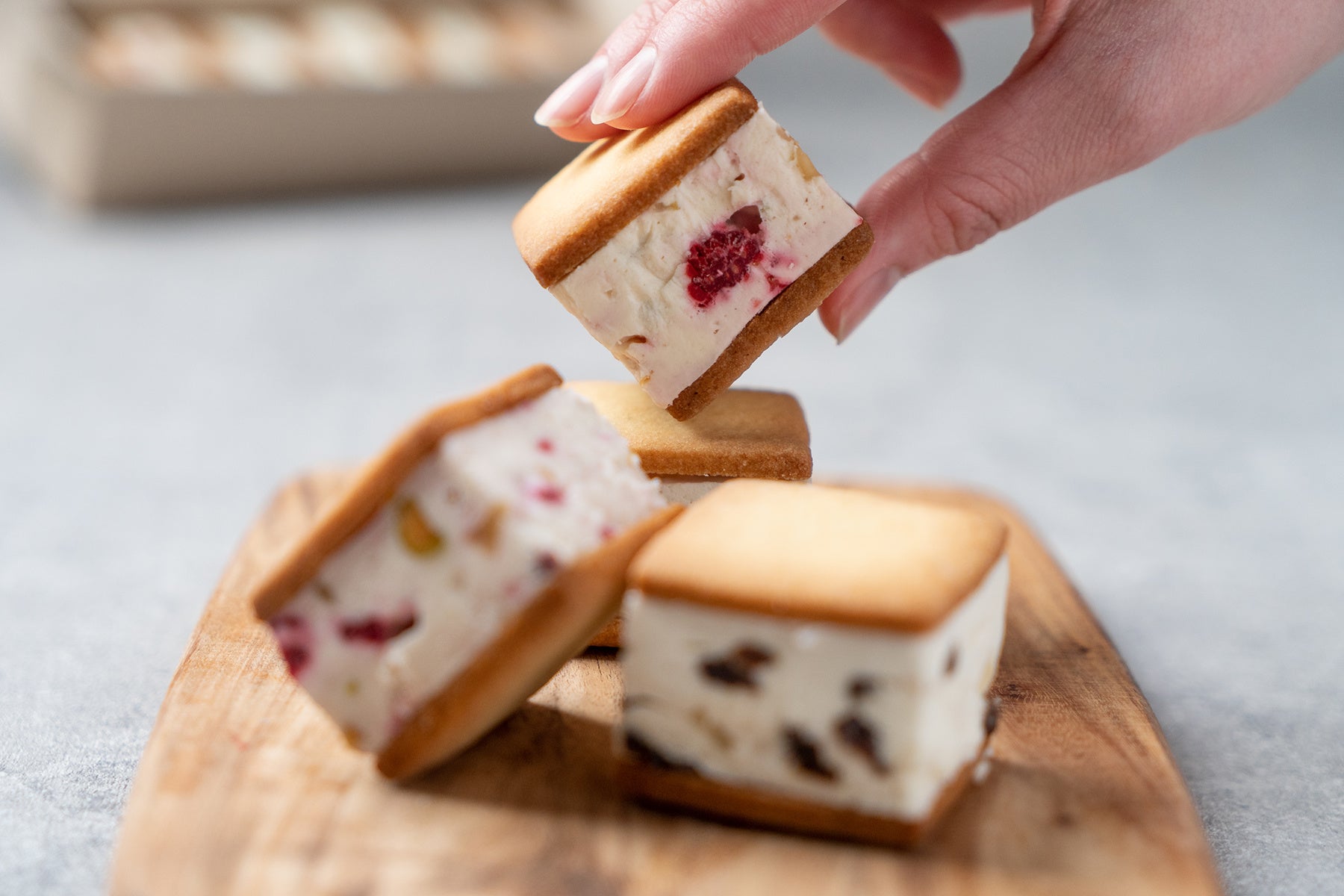 商品ラインナップの「The CASSATA ザ・カッサータ」と「The RAISIN ザ・レーズン」をアーモンドたっぷりのサブレでサンドしました。