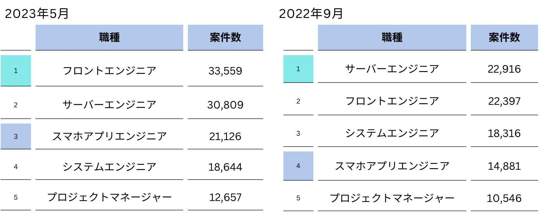 また上位3職種では、2022年9月時点では、3位のシステムエンジニアと3,500件以上の差をあけて4位であったスマホアプリエンジニアが、2023年5月時点ではシステムエンジニアと2,500件以上の差をあけて3位にランクインしました。