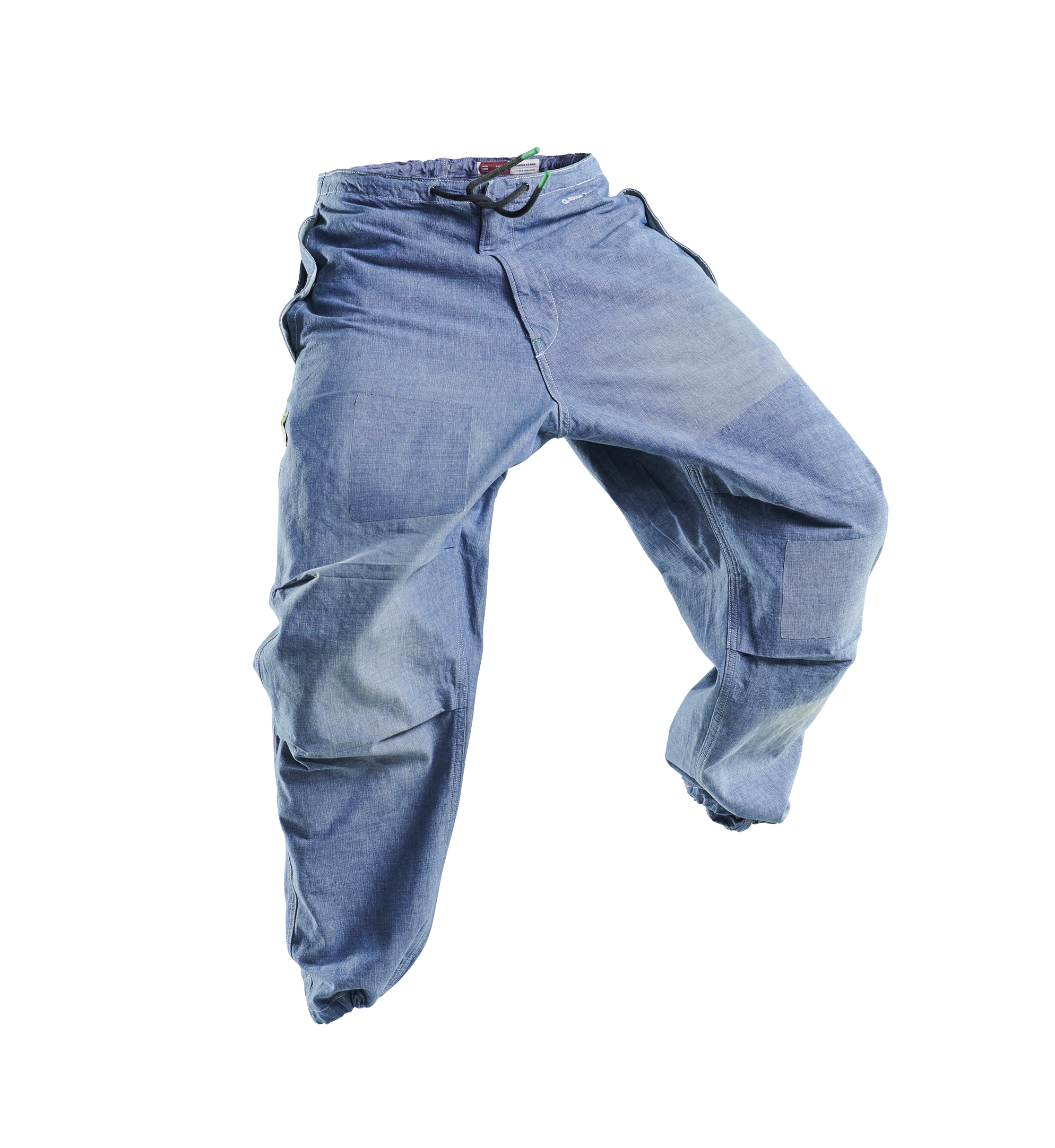 膝部分に 3D 効果を出して、ゆったりと仕上げたパンツ。両サイドのプリーツが ボリューム感とシェイプ感をプラスしています。 裾の内側のドローコードを絞ることで足首周りにさらにボリュームを出すこと も可能。膝にパッチが接着されています。サイドシームに隠しスナップ付きのフ ラップポケット付き。 バックにひとつ付いたフラップポケットには、フラップの上から打消し線を引く ように刺繍ステッチがかけられています。