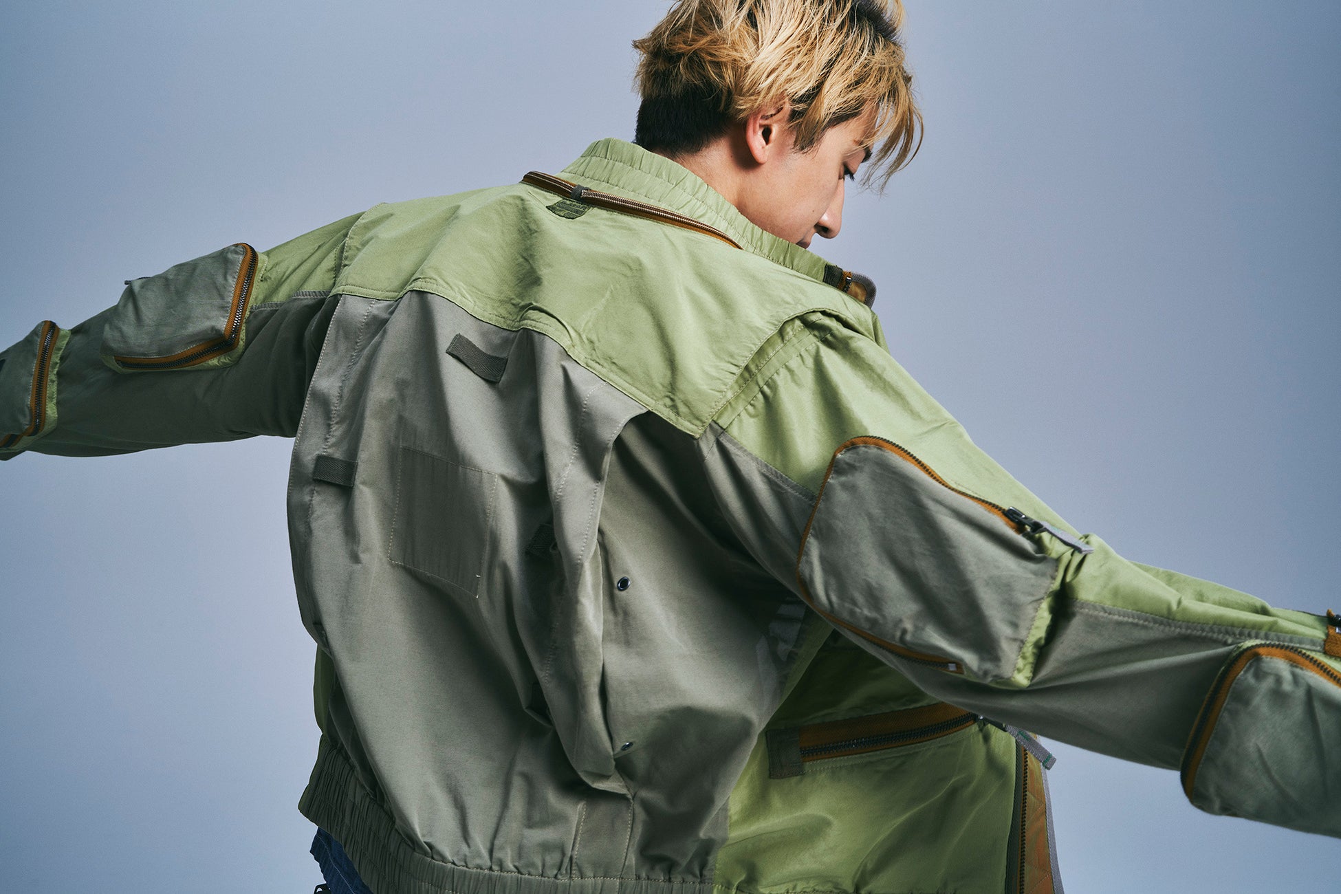 ジッパー付き、ペンコンパートメント付き、織りラベル付きなど、様々な スタイルのベローズポケットを備えています。 胸の深いポケットは両開きジッパー仕様。片側に小さなフラップポケット とシースルーのインサーションが組み合わされています。 ルーズフィットのシルエットはウエストの織りベルトを絞ることでシェイ プ可能。袖ジッパーを使って袖口をぴったり閉じることも可能です。