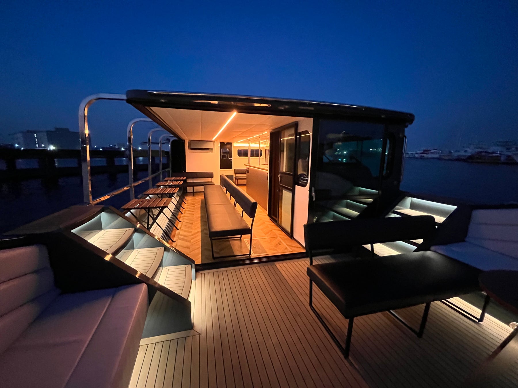 船上のBARのために設計された完全オリジナルリバークルーズ船「WATERWAYSⅢ」は、BARで最も重要な「雰囲気」を出すために、屋根がありながらも開放感あふれるレイアウトやムードを演出する間接照明、そして清潔感のあるお手洗い等細部にまでこだわった設計になっております。大切な方と特別なひと時をお過ごしください。