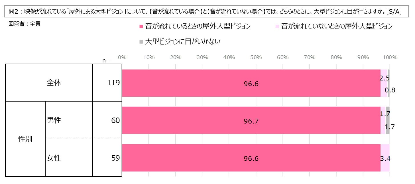 ⊳ Q2.屋外大型ビジョンの音の有無による印象比較では「音が流れている時の屋外大型ビジョン」が9割半ばを超えて圧倒的に多かった。性別での大きな差は見られなかった。
