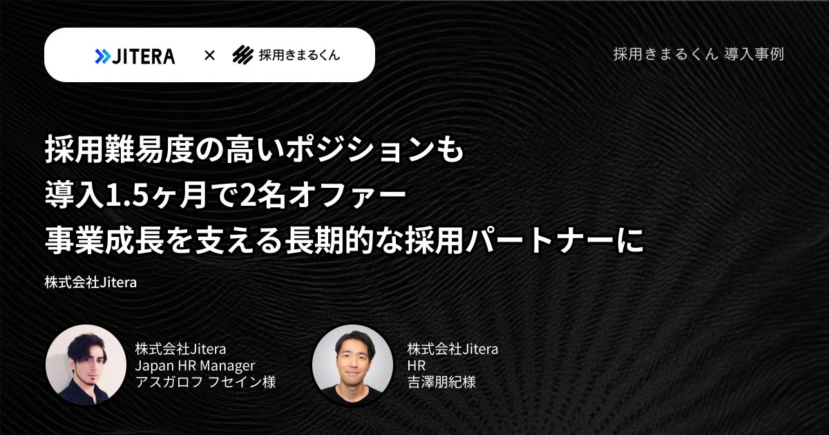株式会社BetaMind(本社:東京都渋谷区、代表取締役:吉田健人、以下 BetaMind)は、2025年6月18日、株式会社Jitera(本社:東京都港区、代表取締役:栁澤 直、以下 Jitera社)の採用活動における「採用きまるくん」の活用事例インタビューをウェブサイトにて公開いたしました。