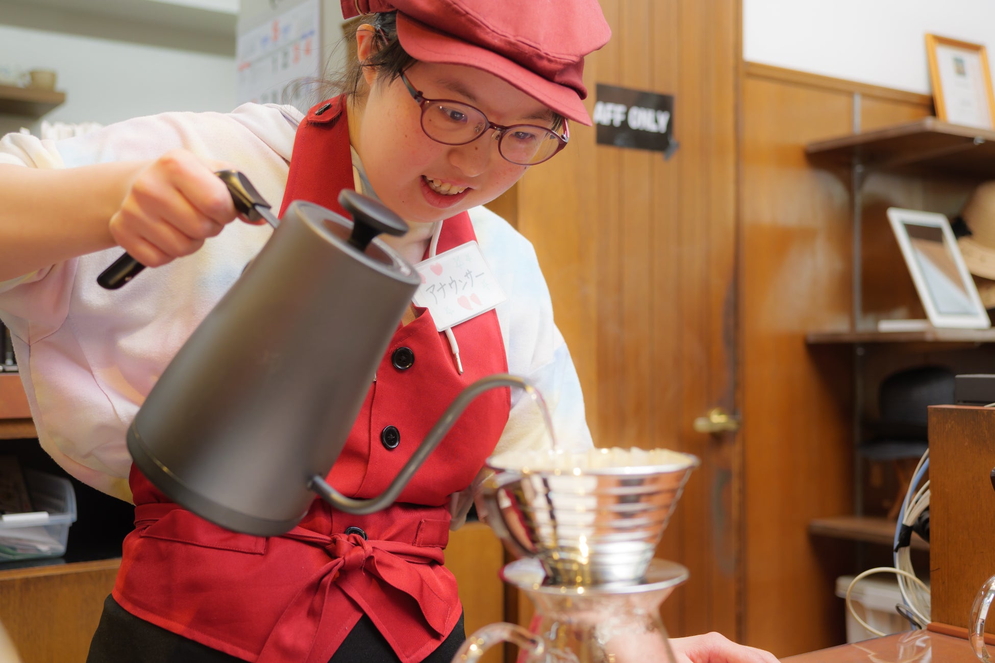 ハンドドリップでコーヒーを淹れたり、簡単な調理や接客をしたりしています。お客様とお話をするのが好きな店員さんや、すぐに疲れてしまいお客様の席で休憩をする店員さん、黙々と働く店員さんなど、気まぐれに楽しそうに働いています。