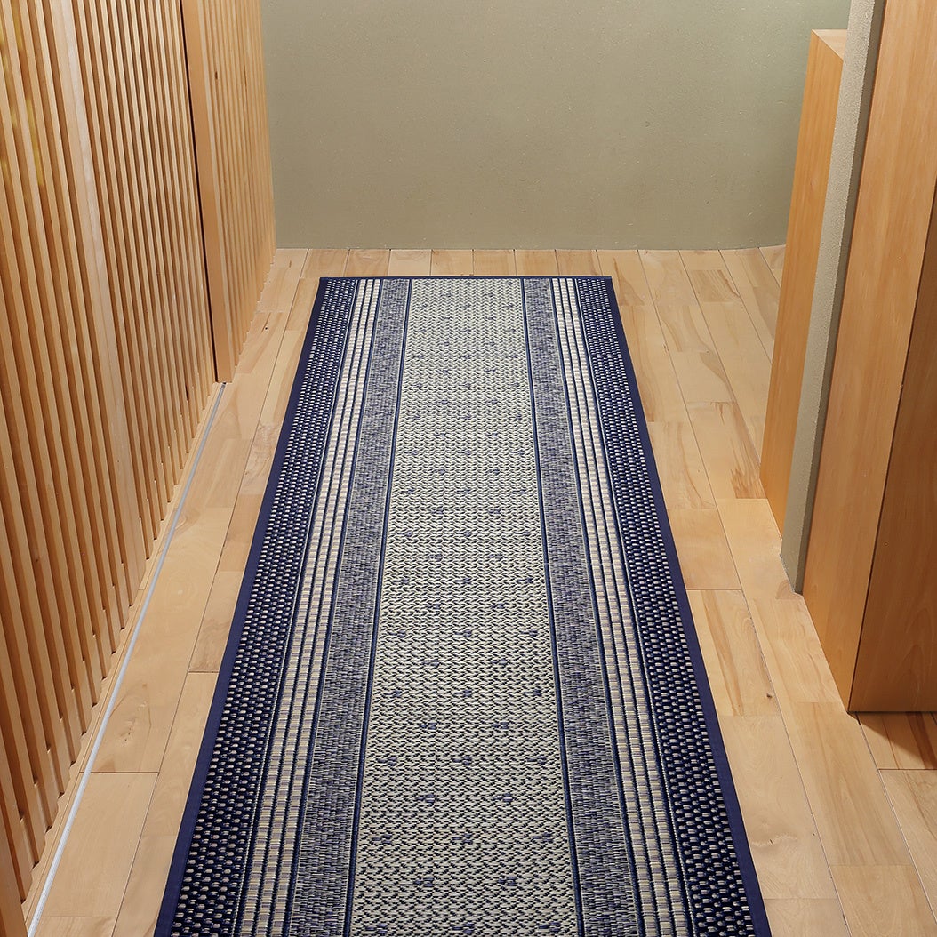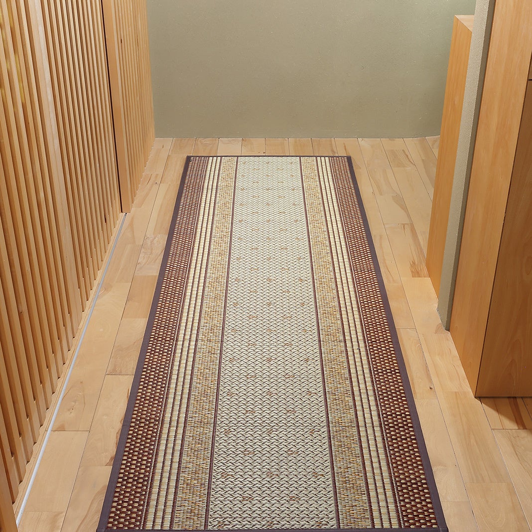 4種類の模様を組み合わせて織り上げたモダンなデザインの廊下敷きカーペット。 染めていないナチュラルない草と濃淡2色のい草で織り上げているので、派手な過ぎない上品な仕上がりです。