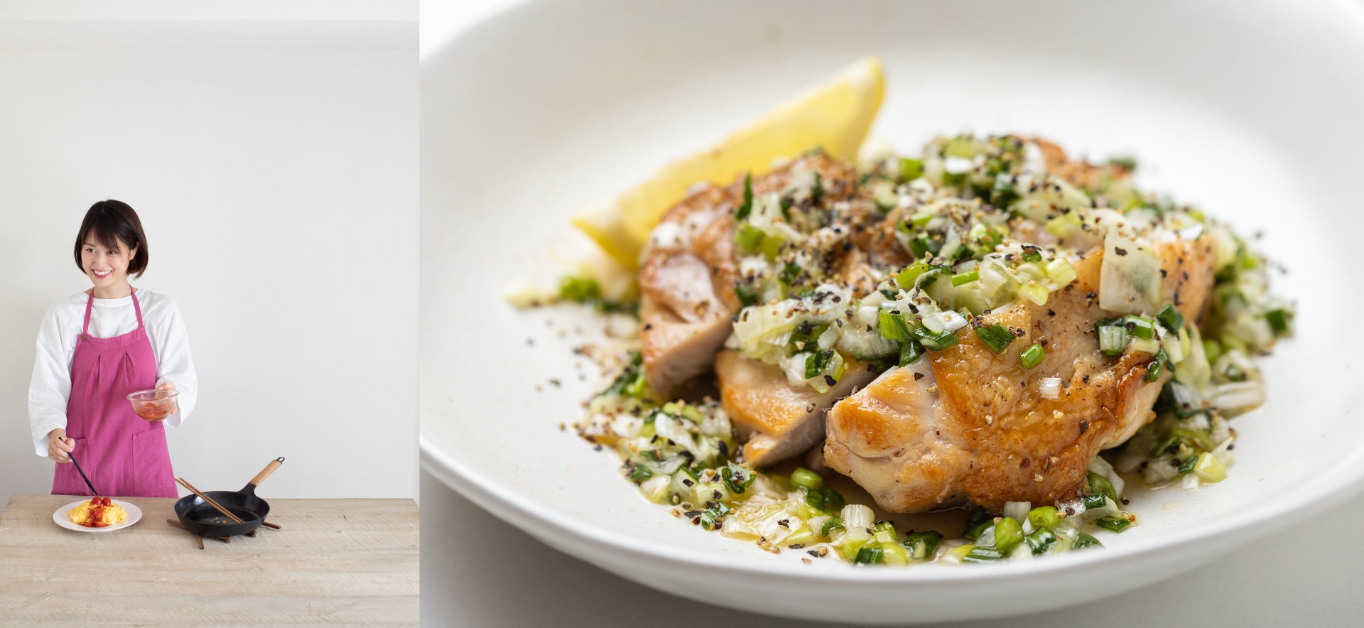 「ジューシーな鶏もも肉をネギレモン塩でさっぱり風味に仕上げました。直前でレモンをかけることでレモンの香りが食欲をそそります。黒胡椒でパンチの効いた大人の味です。そのままはもちろんのこと、ご飯のお供やお酒との相性も抜群です。」