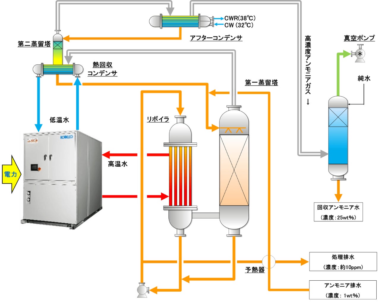 熱回収コンデンサ内でアンモニアを含むベーパー全量が凝縮すると、露点降下を起こし、ヒートポンプの加熱COP低下を招きます。そこで、第二蒸留塔を設け、熱回収コンデンサで分縮操作することにより、アンモニアを第二蒸留塔でもさらに蒸留することにしました。第二蒸留塔はリボイラを用いず、余剰熱だけで稼働するため、熱効率を向上させることに成功しました。