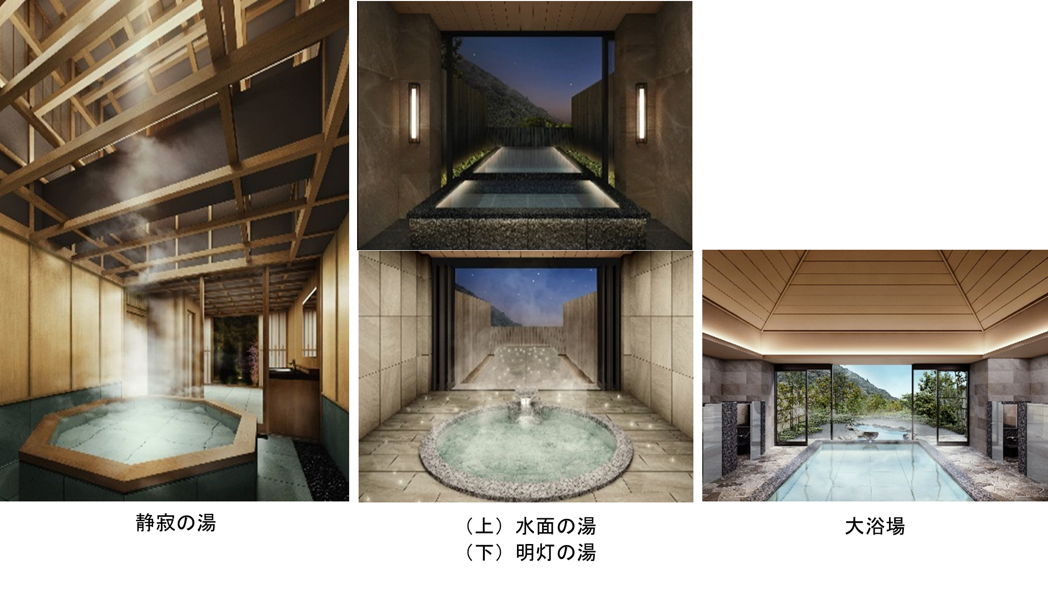 館内の温泉は、浴室とパウダールーム、くつろぎスペースを備えた趣向の異なる4つの貸切風呂と、2つの大浴場を新設することで、存分に湯めぐりをお楽しみいただけます。なかでも露天の貸切風呂「川音(かわと)の湯」は、景色とお湯が繋がり、大自然との一体感を楽しめる造りとしており、湯上りには冷えた「足柄の水」などで喉を潤していただけます。