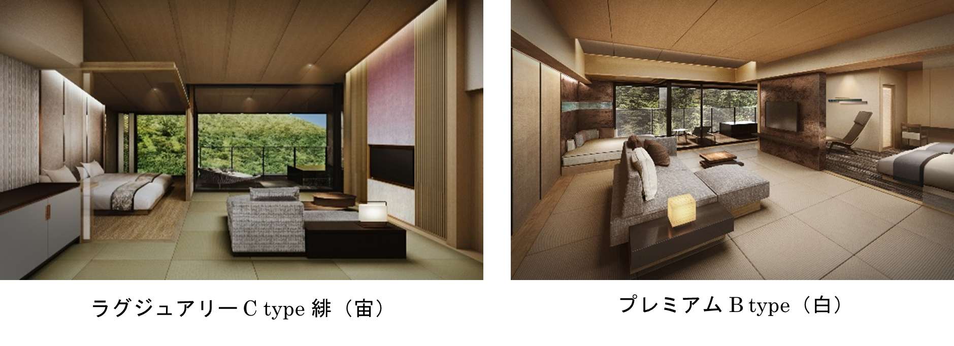 リニューアルで全室拡張し、自然の温もりをゆったり心地よく感じられる全35の和風モダンの客室には、自家源泉の名湯「美人の湯」の露天風呂を備え、プライベートのなか至福の時間を思うがままに過ごして心を解きほぐしていただけます。