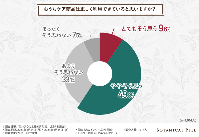 「おうちケア商品は正しく利用できていると思いますか?」と質問したところ、『とてもそう思う(9.6%)』『ややそう思う(49.8%)』『あまりそう思わない(33.1%)』『まったくそう思わない(7.5%)』という回答結果になりました。
