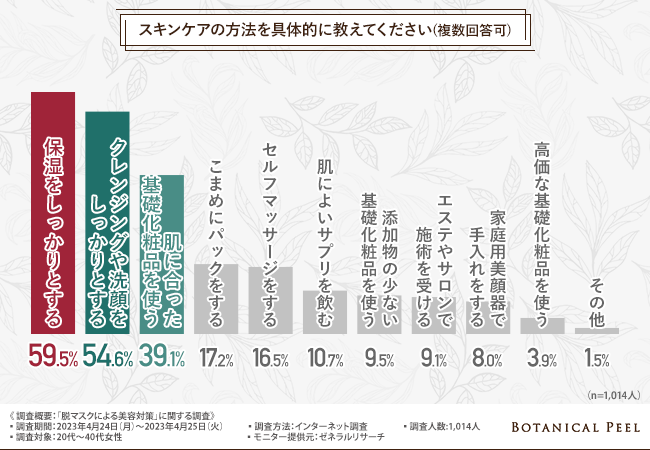 「スキンケアの方法を具体的に教えてください(複数回答可)」と質問したところ、『保湿をしっかりとする(59.5%)』と回答した方が最も多く、次いで『クレンジングや洗顔をしっかりとする(54.6%)』『肌に合った基礎化粧品を使う(39.1%)』『こまめにパックをする(17.2%)』『セルフマッサージをする(16.5%)』と続きました。