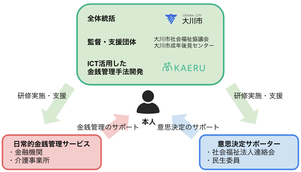 仕組みづくりを考えるにあたり、人口減少による担い手不足は金融機関や介護事業所など地域のあらゆる産業において共通の課題であることから、できるだけ人的コストをかけずに新たな仕組みづくりを検討する必要があります。このため、KAERU株式会社の「KAERU」というICTサービスの仕組みを活用し、大川市社会福祉協議会、大川市成年後見センターと共に、地域の金融機関や医療機関、社会福祉法人等と協議を重ねながら、本市の市民が「住んで良かった、これからも住み続けたい」と感じられるよう、ニーズに応じた新たな金銭管理・意思決定支援の仕組みづくりに取り組みたいと考えています。
