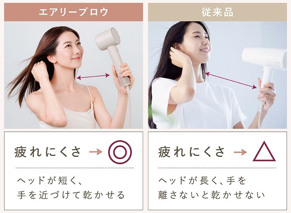 一般的なドライヤーの重さは600g前後とされており、ヘアケア市場でも軽量な345gにすることで長時間持っていても疲れにくい仕様に。また、本体の重心を中心にし、本体を振る際にかかる手首への負担を大幅に軽減。使いやすさを意識したデザインになっています。
