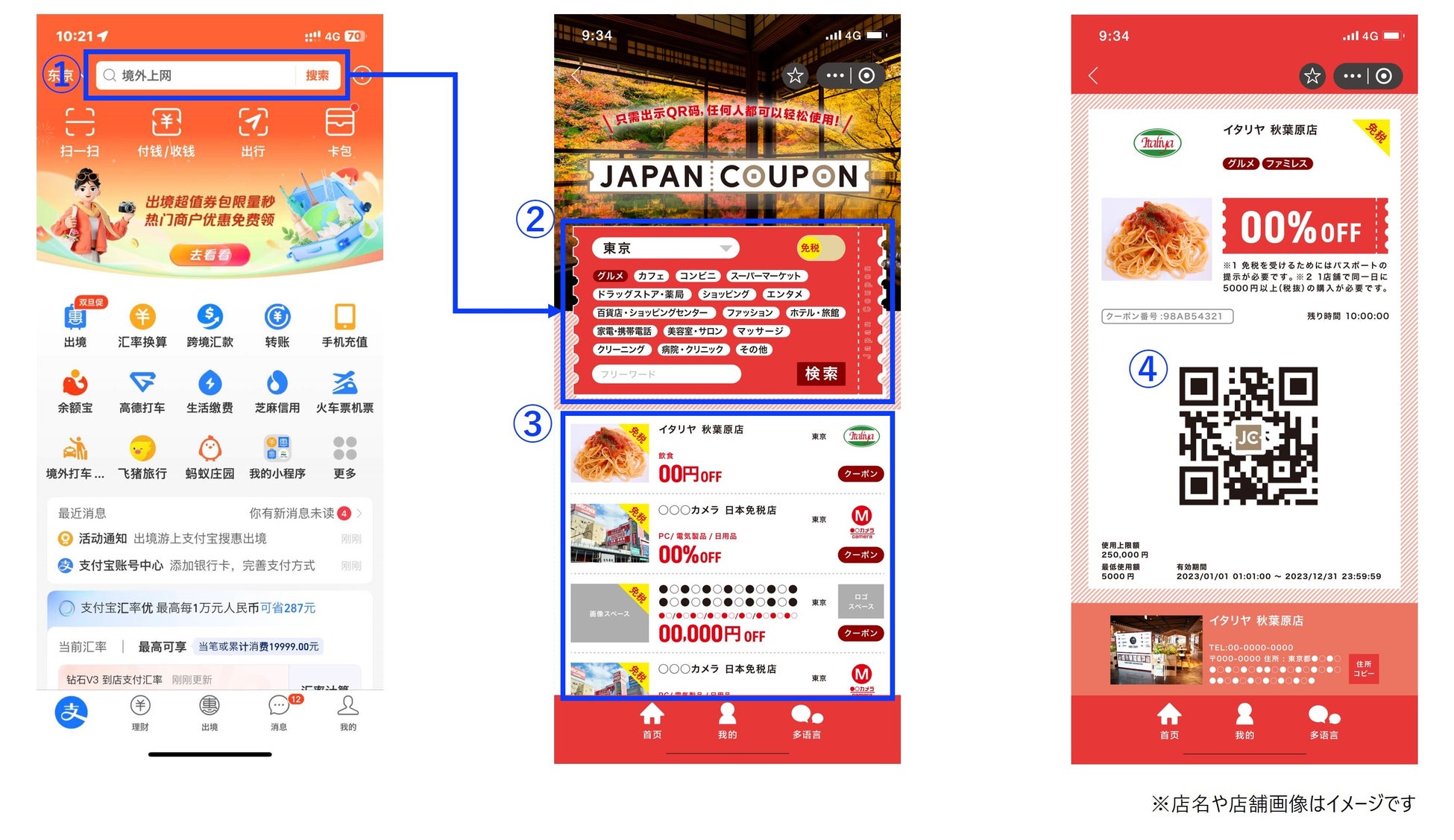 ①Alipayアプリのトップページの検索機能から「Japan Coupon」を選択