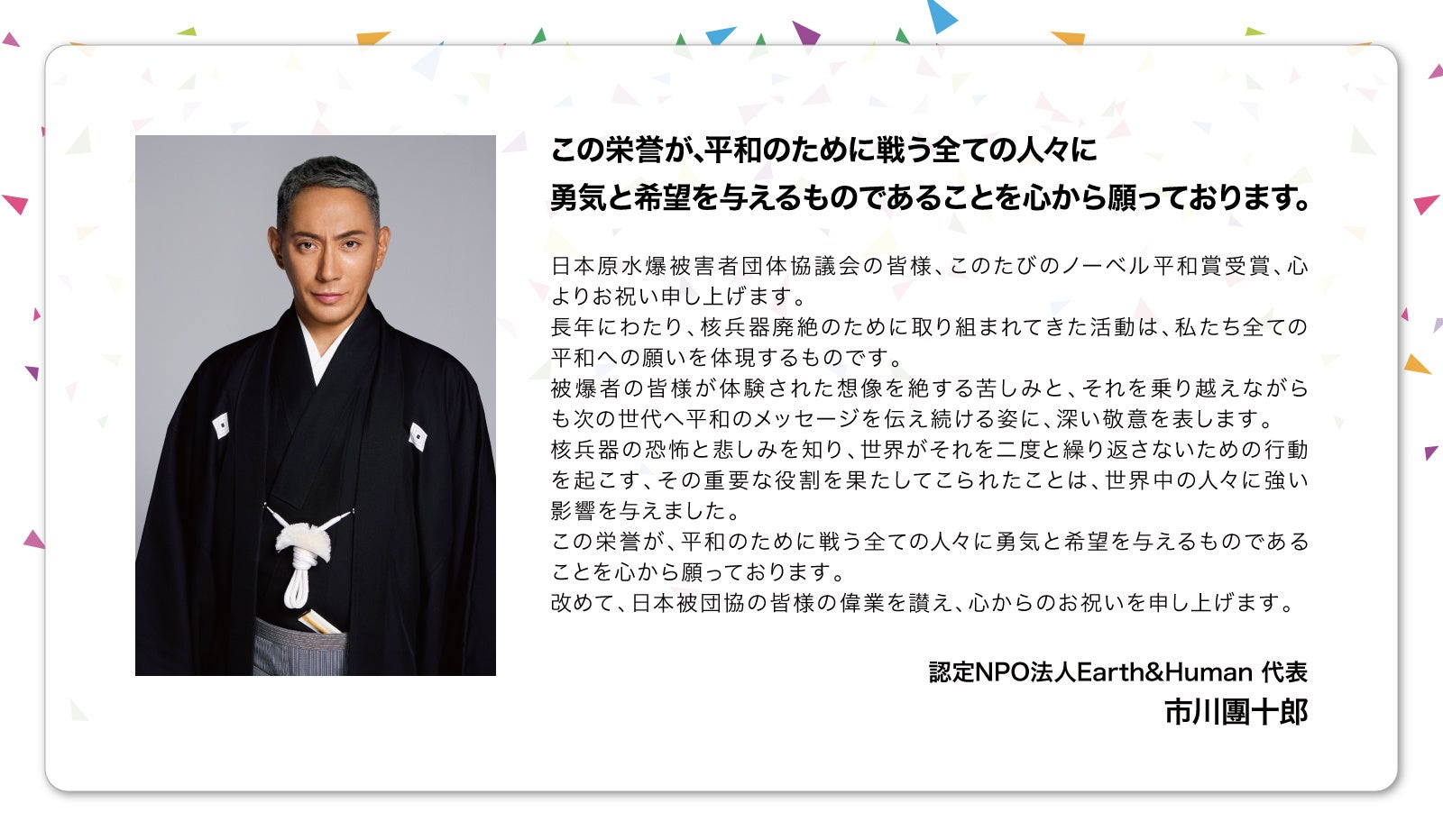 12/10(火)日本被団協のノーベル平和賞授賞式に向けて、市川團十郎さん、SUGIZOさんらが、お祝いメッセージを発表!
