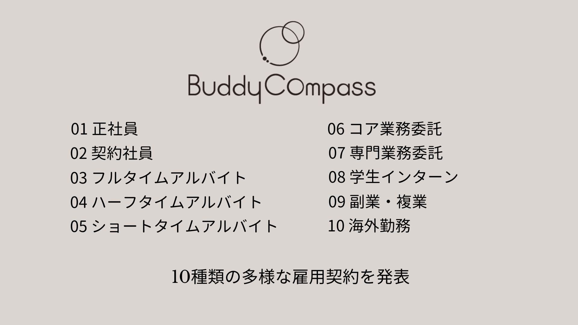 BuddyCompassでは以前より、さまざまな働き方をする仲間と一緒に、共に仕事をしてきました。今回改めて契約形態を整理し、働き方に縛られず活躍する仲間を増やしていきたいと考えています。