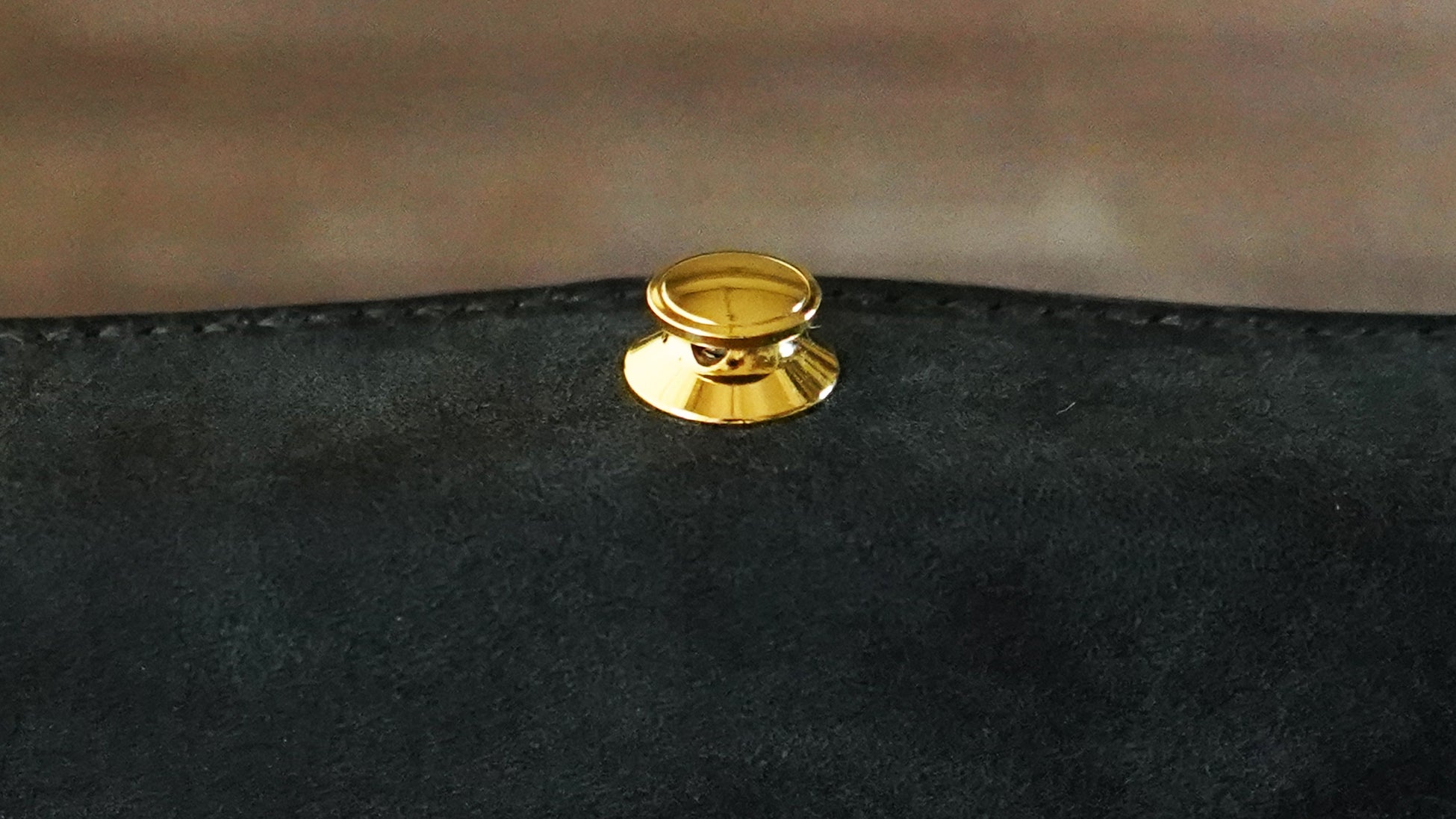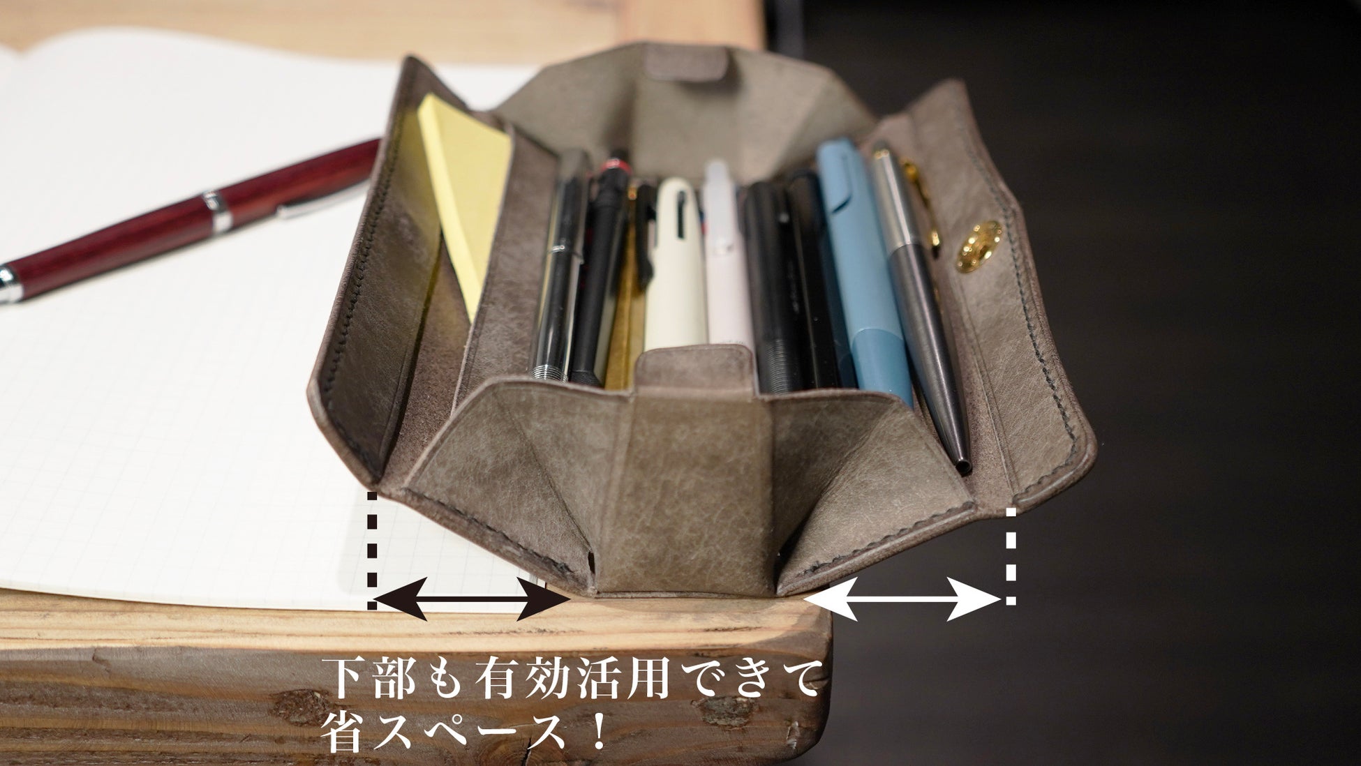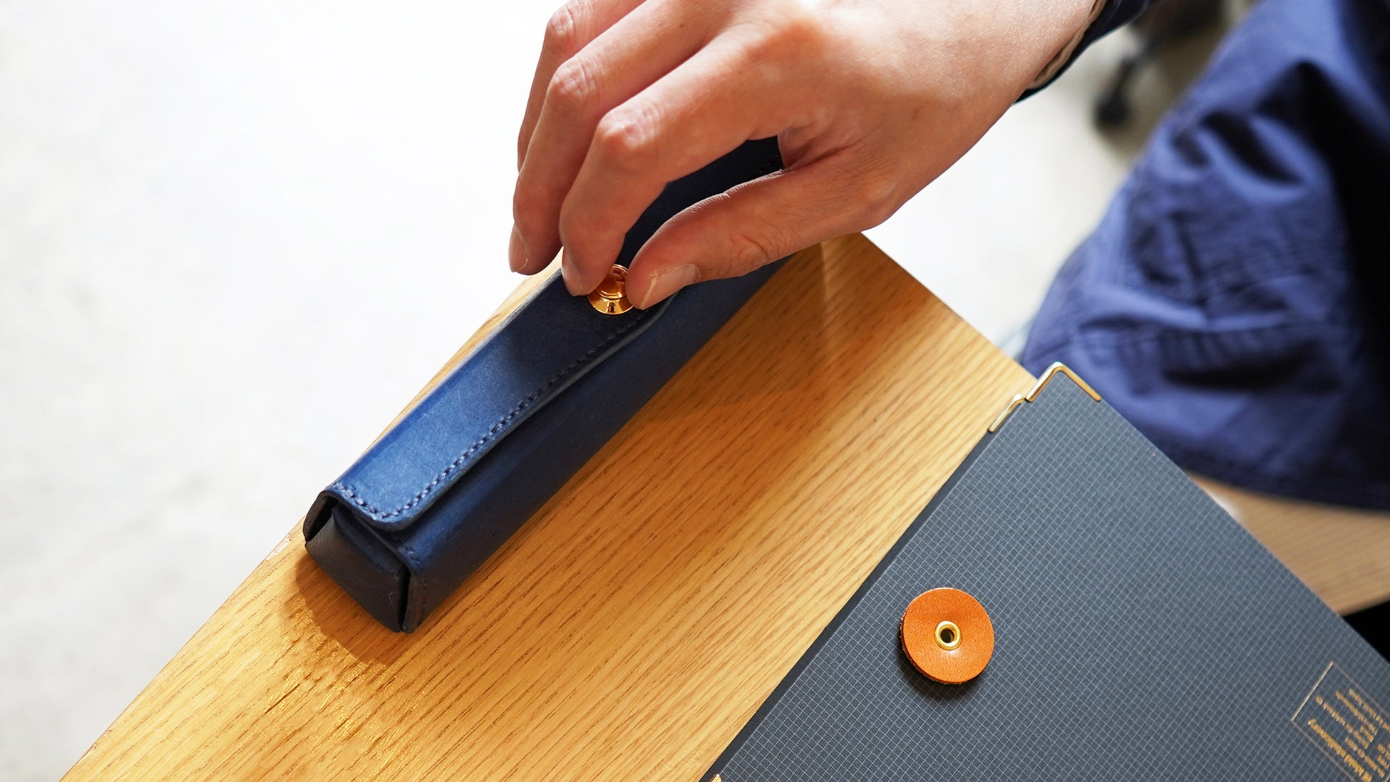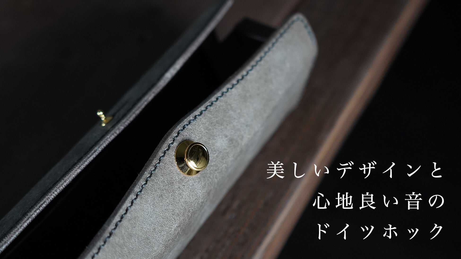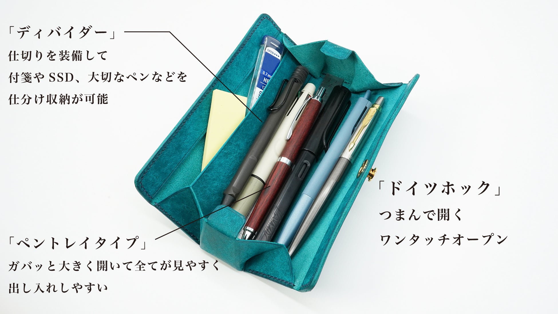 ファスナータイプとは違い、ワンタッチのドイツホックでトップオープン仕様なので、机に置いたまま片手で簡単に瞬時に開閉が可能です!
