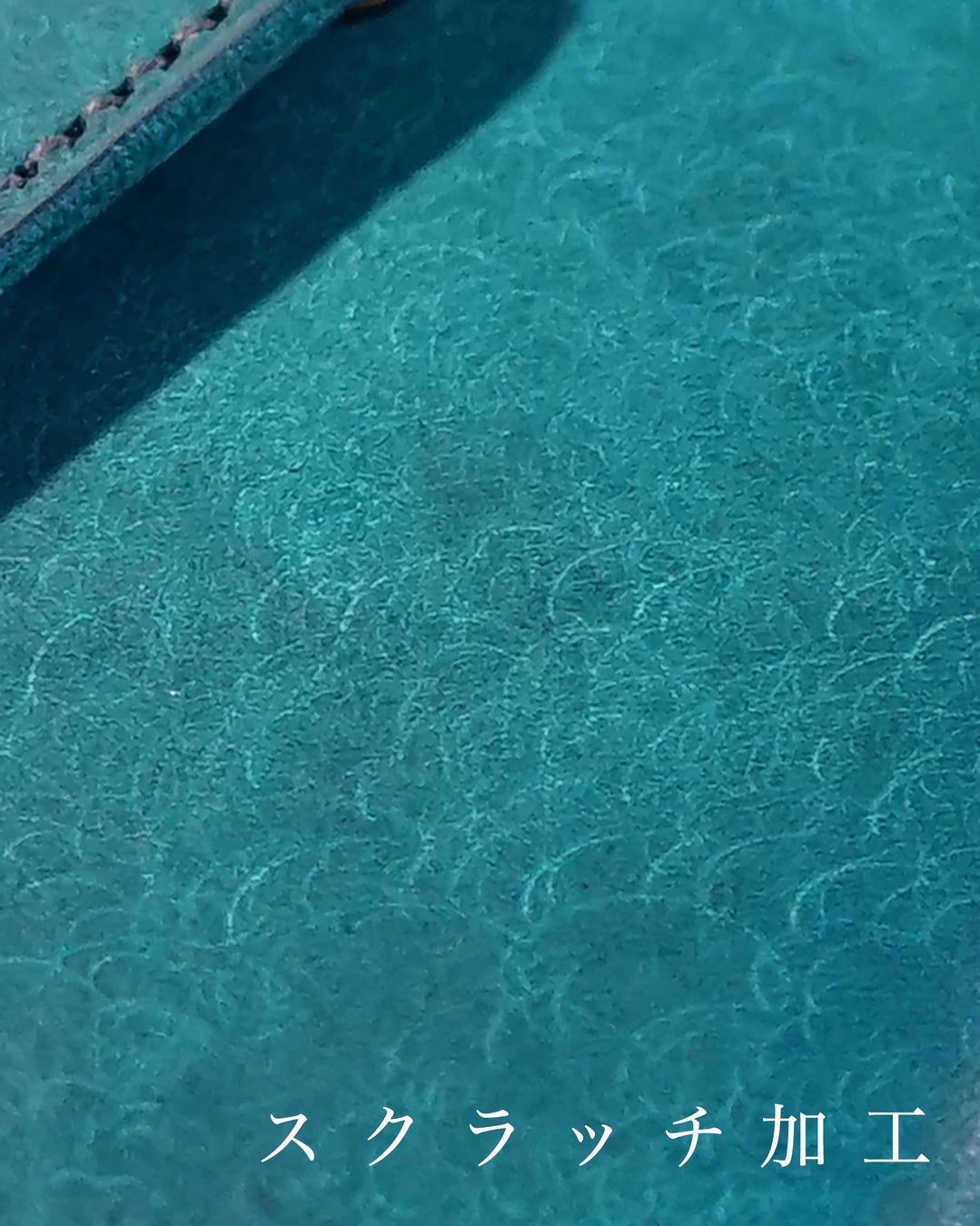 ヨーロッパ産の上質な原皮を使用した、フルベジタブルタンニンレザーにスクラッチ(graffi)加工が施されています。 円を描くような傷がたくさんついているのがスクラッチ加工です。 この加工で革にビンテージのような印象があり、革の表面は少し毛羽立ち、手触りがとても気持ちよく、上質なヌメ革のもちっとした感覚も堪能できます。 お使い頂くほど、毛羽が寝てツヤツヤになっていき、色は濃く変化していきます。かなり早く毛羽が寝ていくので、エイジングを短期間で味わえるのも特徴です。