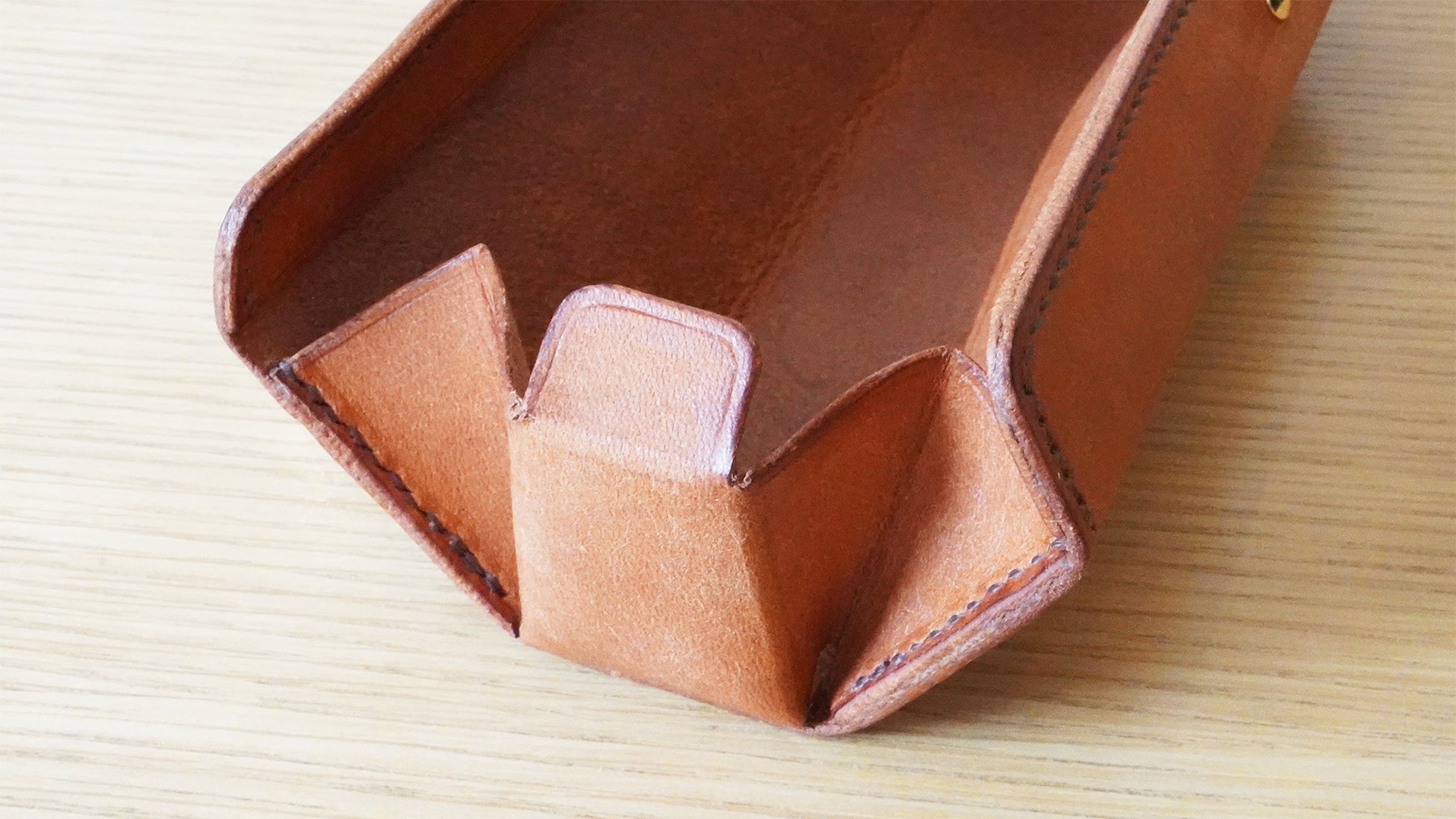 「シンプルで、スムーズに広がって閉じるマチ構造」を考え、ケーキの折り箱や折り紙から着想を得た『折マチ』。本体革はバケッタレザーでオイルが多く浸透しているので、折り目がつきやすく、形状を保持しやすい特性を活かしました。