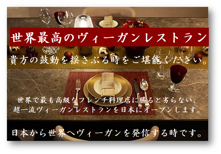 「食べられる動物を無くす動物愛護」の活動:超一流と言われる今までになかった最高級ヴィーガンレストランを日本にオープンさせていただきたく、ご協力をお願い申し上げます。