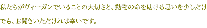 「食べられる動物を無くすための動物愛護」の活動を、ヴィーガン/ベジタリアンの皆様と同じ気持ちで、別の角度から、ヴィーガン/ベジタリアン/プラントベースへの取り組みを行っております。