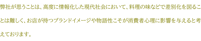 ■弊社が考えることは、どれだけ美味しい料理を作っても、その作り方などの情報は、すぐにネットの世界で拡散されるため、料理の味などで差別化をはかることは、ネットやAI社会の中においては難しいと考えます。(但し、料理の味クオリティーにおいて最高と言われる自信を持っております)