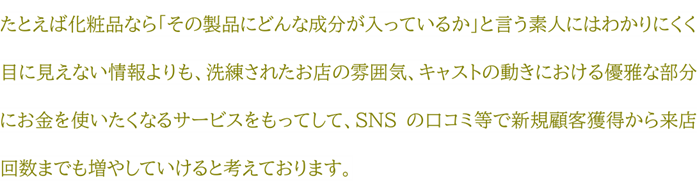 ■【リオ・ホワイト】が最も重視するのはストーリー、優雅な演出、それらによってお客様に夢のような物語の世界を味わって頂く事が、最も大切です。お店の雰囲気、キャストの動きにおける優雅な部分にお金を使いたくなるサービスをもってして、SNSの口コミ等で新規顧客獲得から来店数までも増やしていけると考えております。