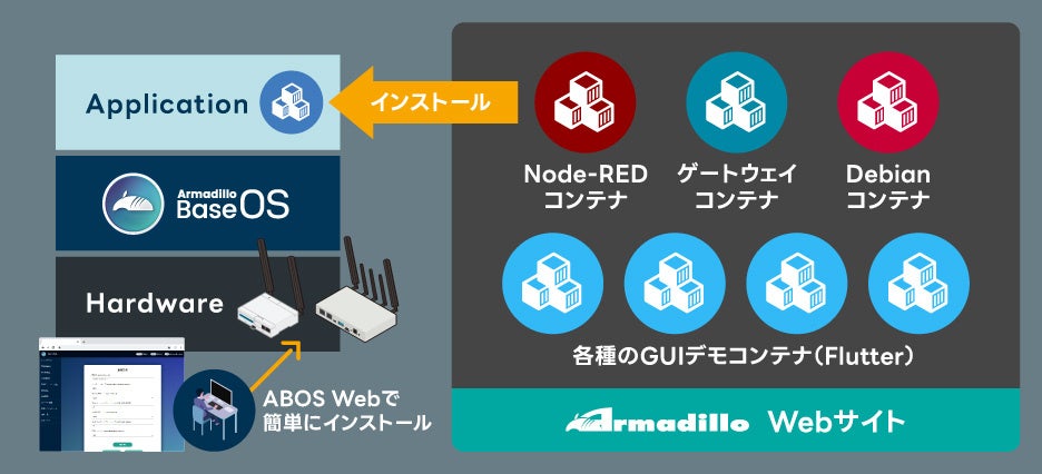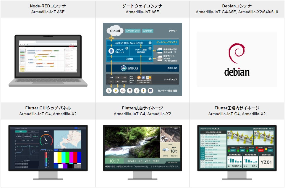ArmadilloのWebサイトにはNode-REDをコンテナ化したサンプルコンテナの他に、接点入出力/RS485とクラウドを簡単に連携できる「ゲートウェイコンテナ」、豊富なソフトウェア資産を簡単に利用できる「Debianコンテナ」、スマートフォンアプリの開発でも使われるGUIフレームワークFlutterをベースとした「Flutterサンプルコンテナ」等が用意されています。目的に合わせたサンプルコンテナを簡単にインストールすることで、PoCや技術検証をすぐに始めることができます。