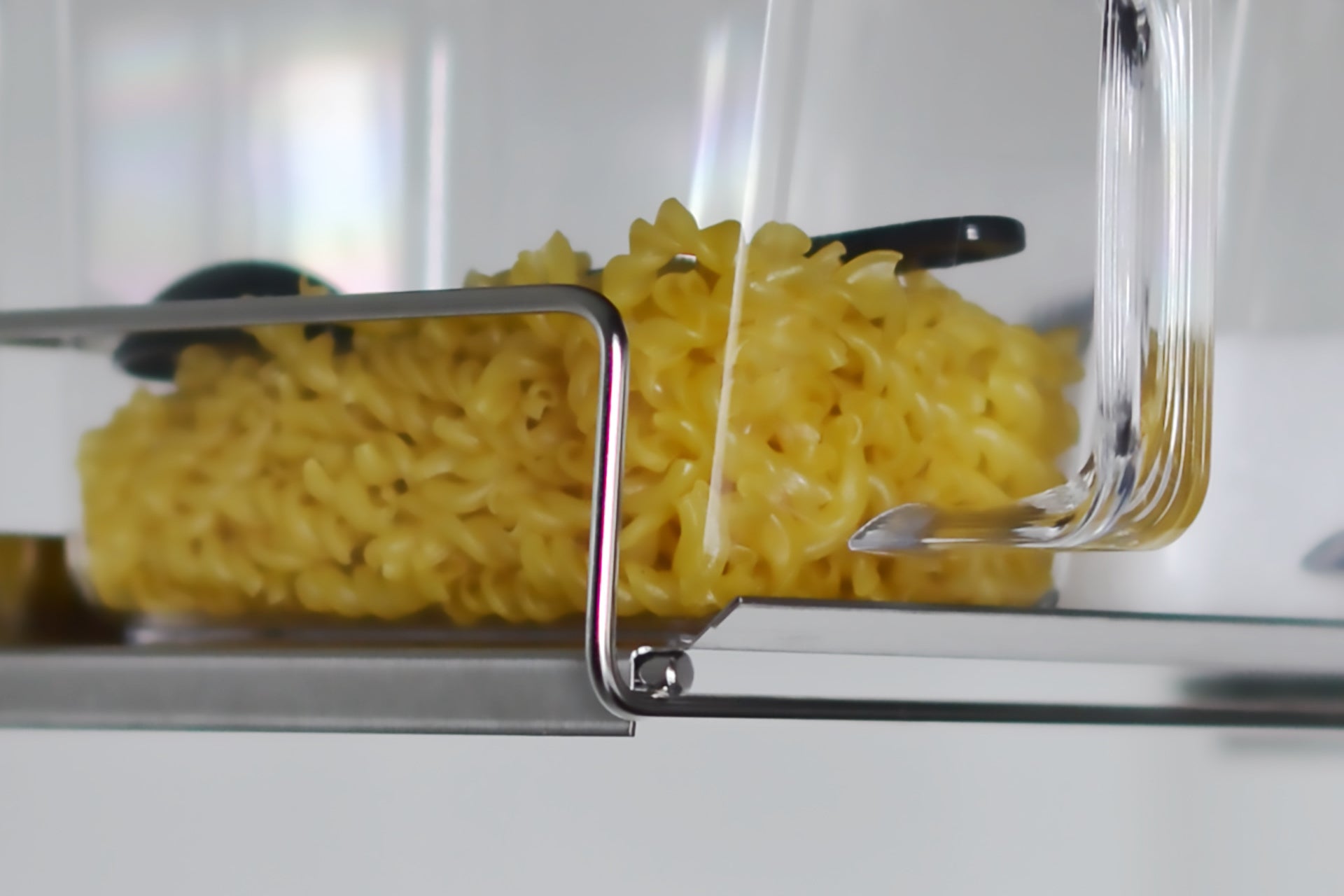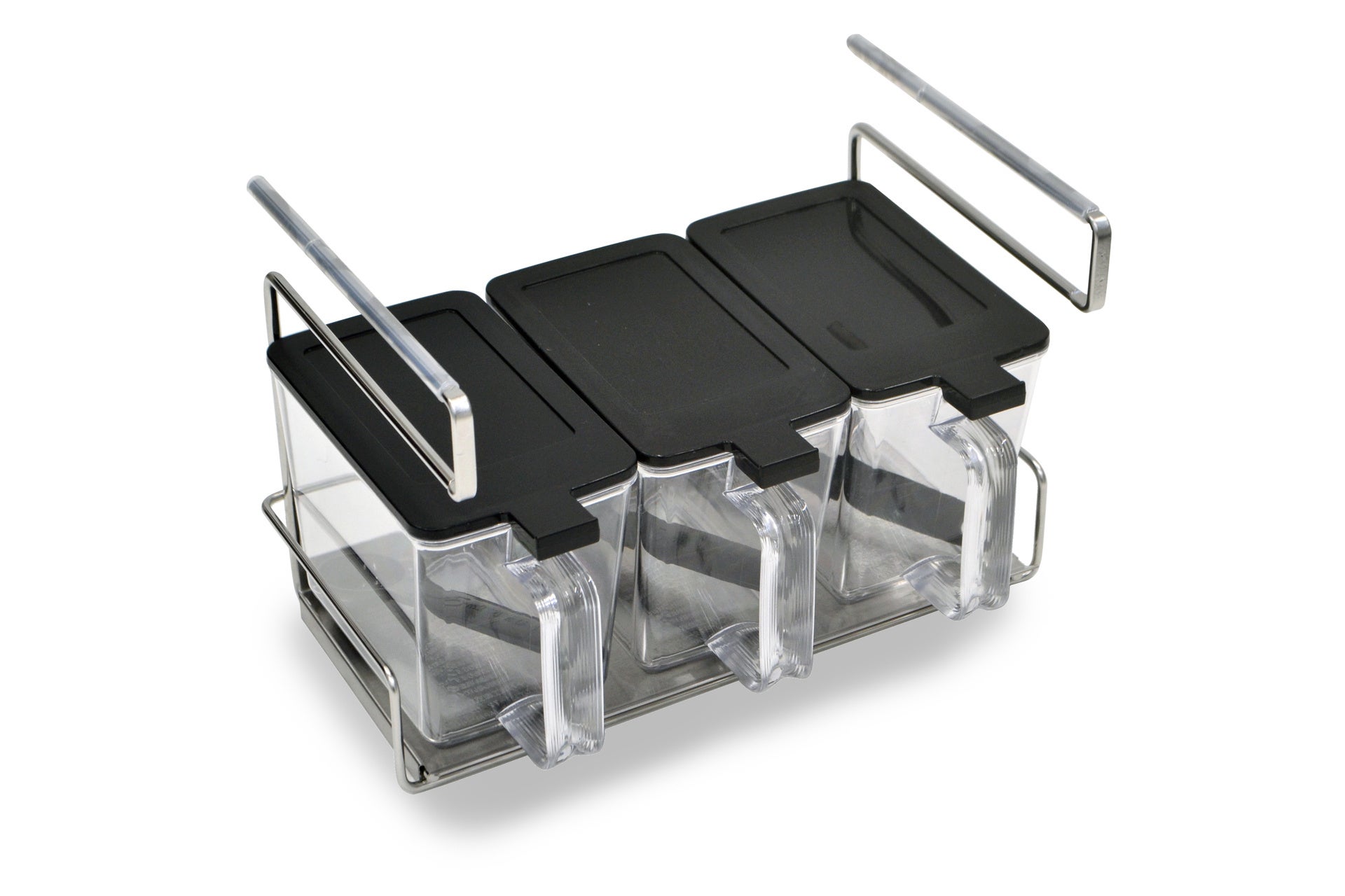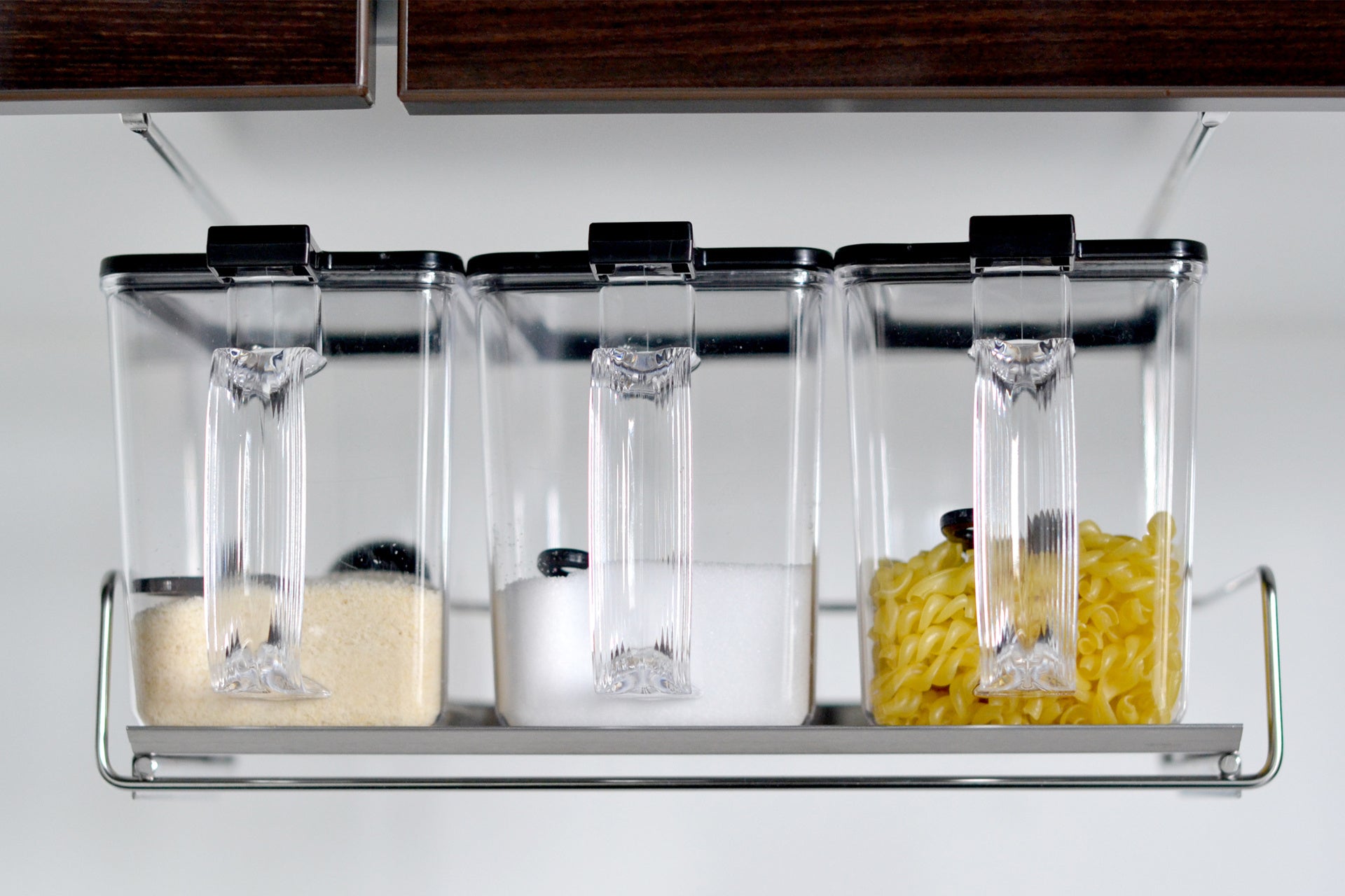 ・吊り戸棚ラックにぴったりのポットが3個ついているので、お好きな調味料を入れてすぐに使えます。
