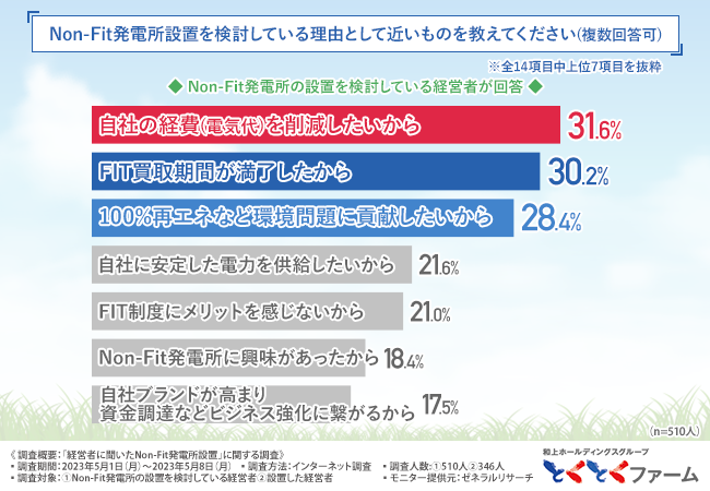 ・Non-Fit発電所の設置を検討している理由は『自社の経費(電気代)を削減したいから(31.6%)』『FIT買取期間が満了したから(30.2%)』『100%再エネなど環境問題に貢献したいから(28.4%)』