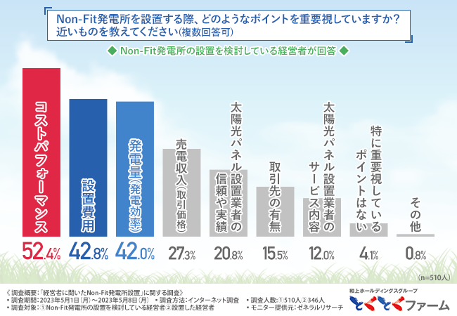 「Non-Fit発電所を設置する際、どのようなポイントを重要視していますか?近いものを教えてください(複数回答可)」と質問したところ、『コストパフォーマンス(52.4%)』と回答した方が最も多く、次いで『設置費用(42.8%)』『発電量(発電効率)(42.0%)』と続きました。