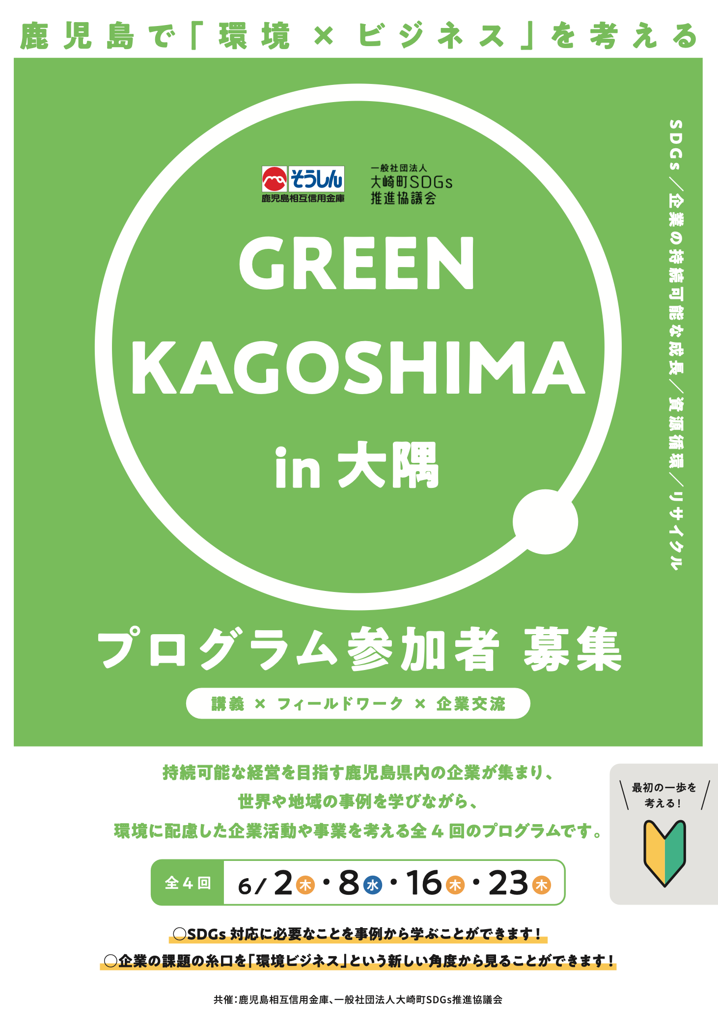 鹿児島県内の中小企業を対象に、環境配慮型のビジネスを学ぶ新しいプログラム「GREEN KAGOSHIMA in大隅」への参加企業募集!