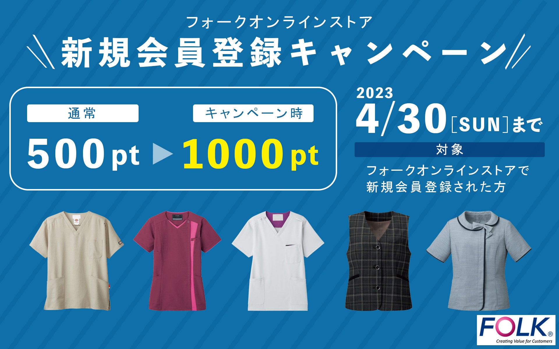 白衣と事務服のメーカー直営「フォークオンラインストア」にて【新規会員登録キャンペーン開催】会員登録でもらえるポイントを通常の2倍、1000ptプレゼント!