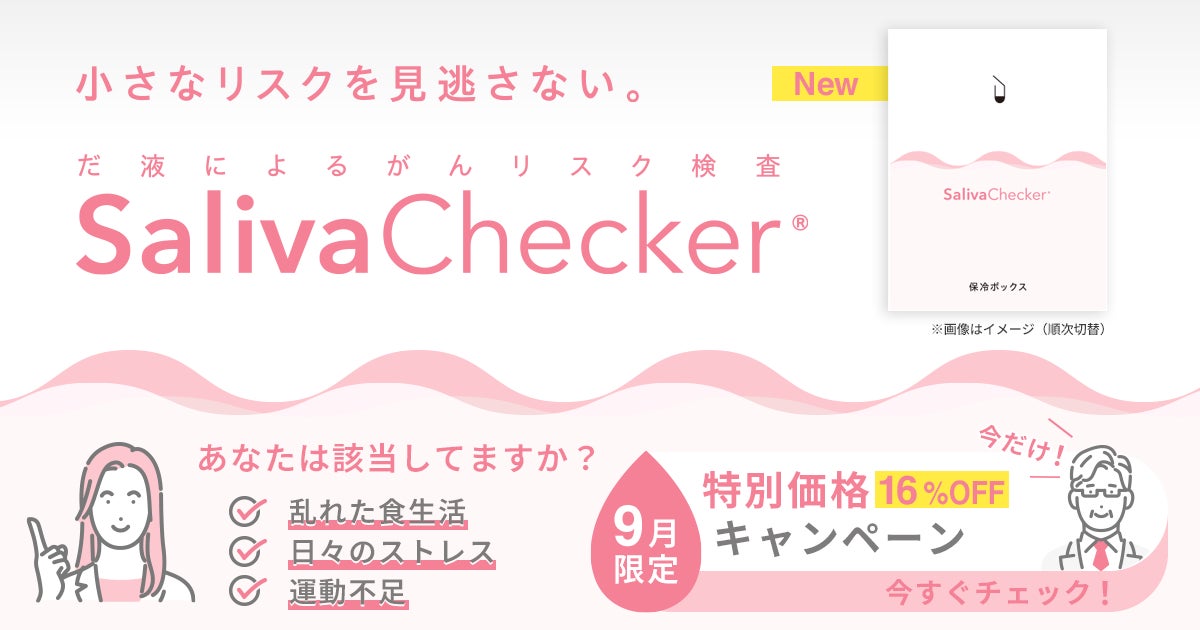 株式会社サリバテック(代表取締役 CEO:砂村眞琴、以下「サリバテック」)は、2024年9月2日よりだ液がんリスク検査サービス「サリバチェッカー®」を「がん征圧月間」の9月にもっと多くの方にお届けしたいという思いから9月30日までの期間限定にて特別なキャンペーンを開始いたします。日本人の2人に1人が「がん」になる時代だからこそ、この機会にがんリスク検査をはじめてみませんか。