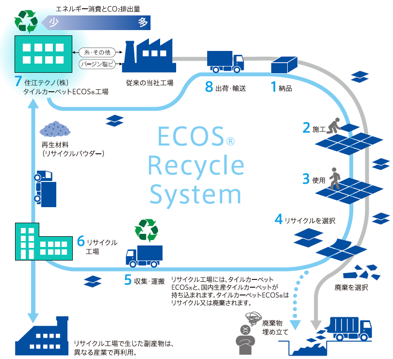 それから当社の環境理念に基づき、環境にやさしいタイルカーペットの製造を目指してきたものの、オフィスで使用され、古くなったタイルカーペットの多くは産業廃棄物として埋め立て処分され、市場にはリサイクル品が供給されず、また再資源化事業者が生産する再生材の需要もなく、回収・リサイクル事業が成り立たないという悪循環がありました。国内で初めてタイルカーペットの製造を始めた先駆者として廃棄物の削減を目指し、①回収・再資源化事業の育成(出資等)②廃製品の回収網整備と再生材の品質改良を行い、日本製の使用済みタイルカーペットを同一製品間で循環させる枠組み(ECOS® Recycle System)を確立。2011年(平成23年)、資源の循環をかつてないレベルで実現した水平循環型リサイクルタイルカーペット「ECOS®(エコス)」を発売するに至りました。