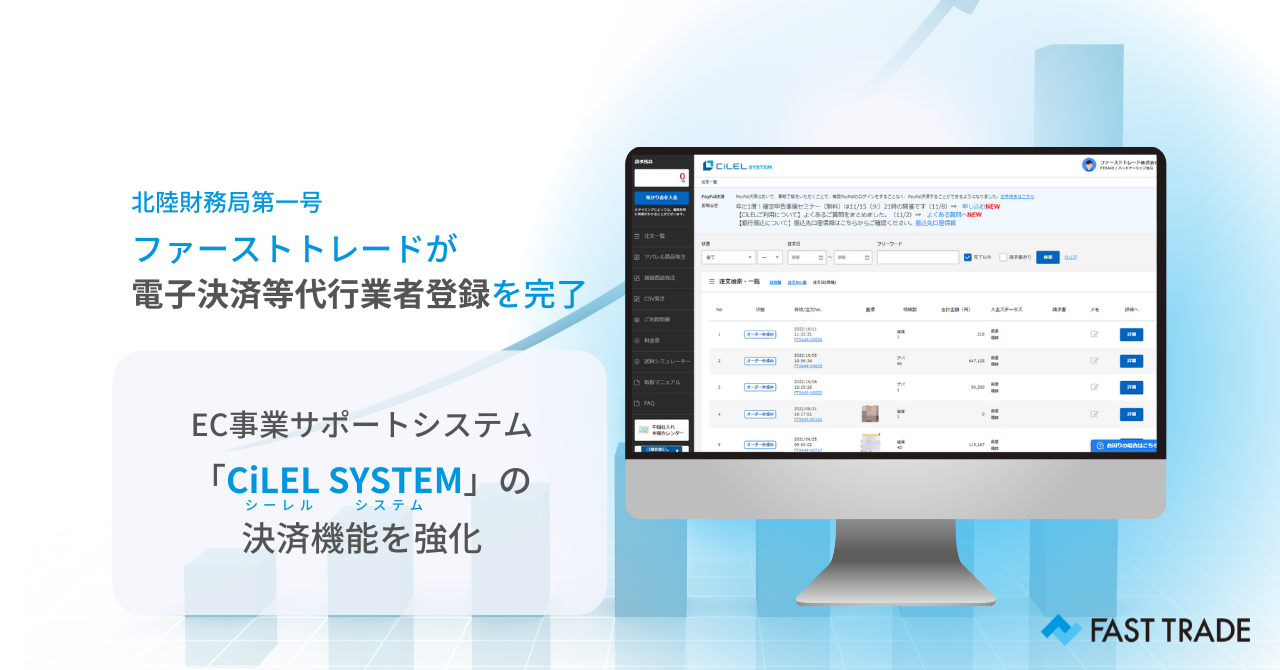 EC事業支援を行うファーストトレード株式会社(本社:福井県あわら市、代表:三上良平、以下 当社)は、2022年11月9日付で電子決済等代行業者の登録(登録番号 北陸財務局長(電代)第1号)を完了した事をお知らせいたします。この登録は北陸地方第一号となります。