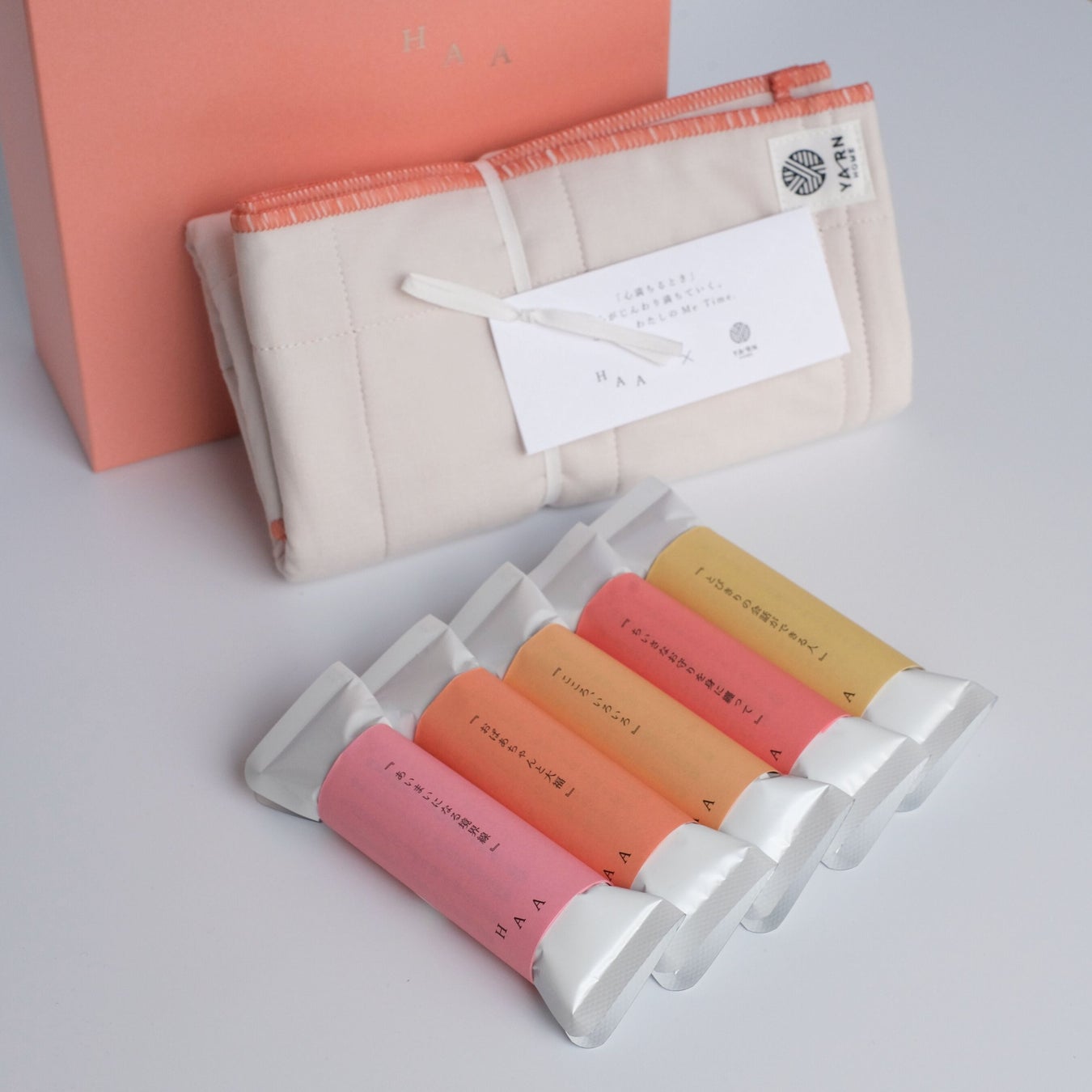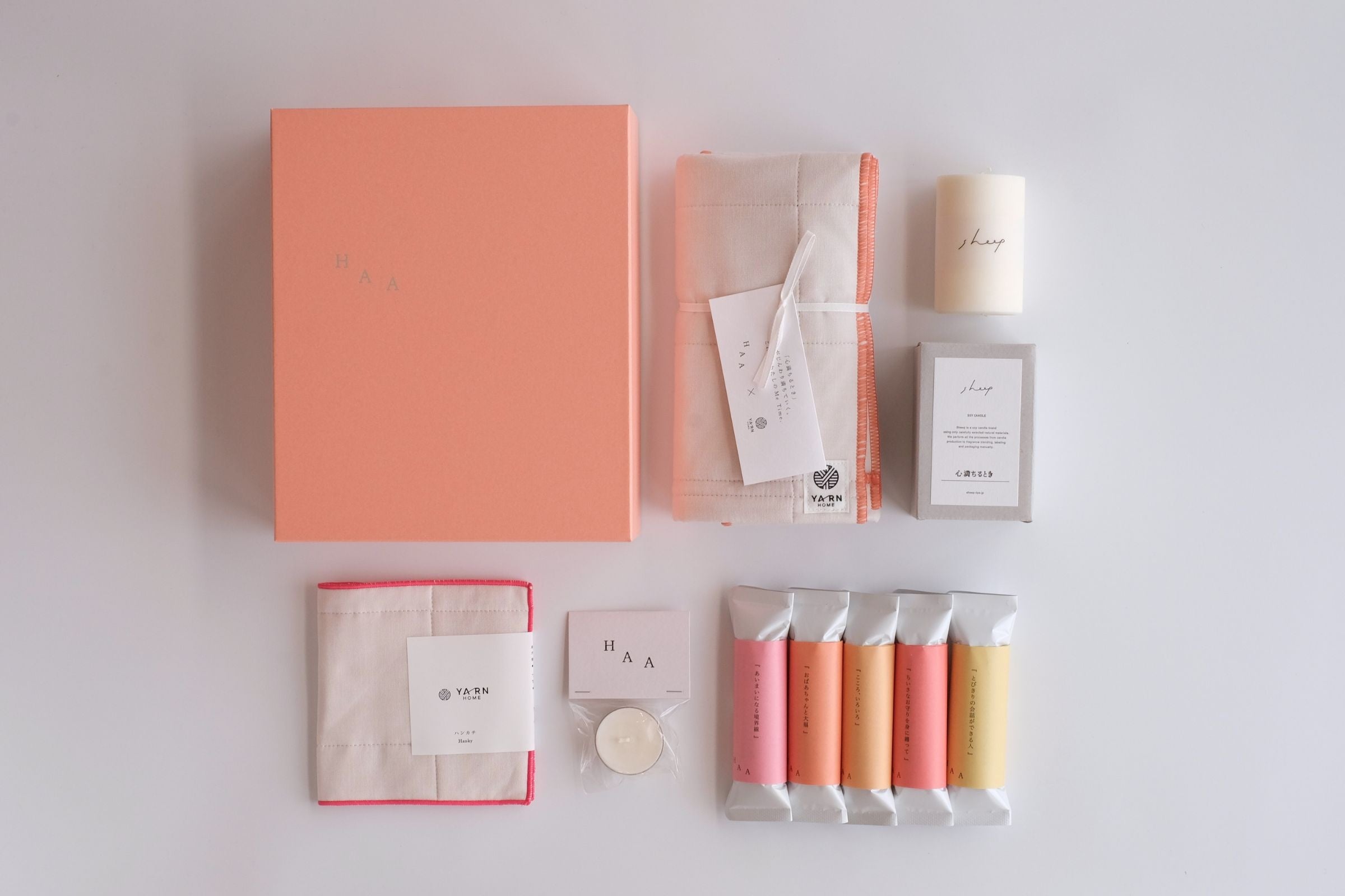 エッセイ付き入浴剤「HAA for bath」、YARN HOMEのタオル(HAAオリジナルカラー)、ハーフハンカチ(Calm)、sheepのアロマソイキャンドル(HAAオリジナルブレンド・SSサイズ)、アロマティーライトキャンドル(CHAI)のセット