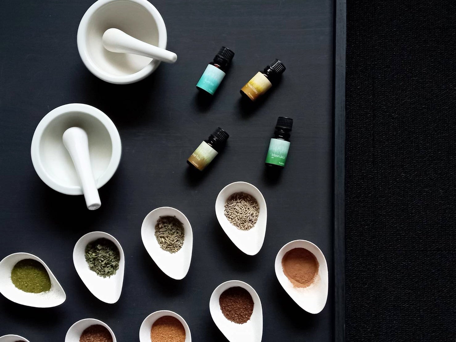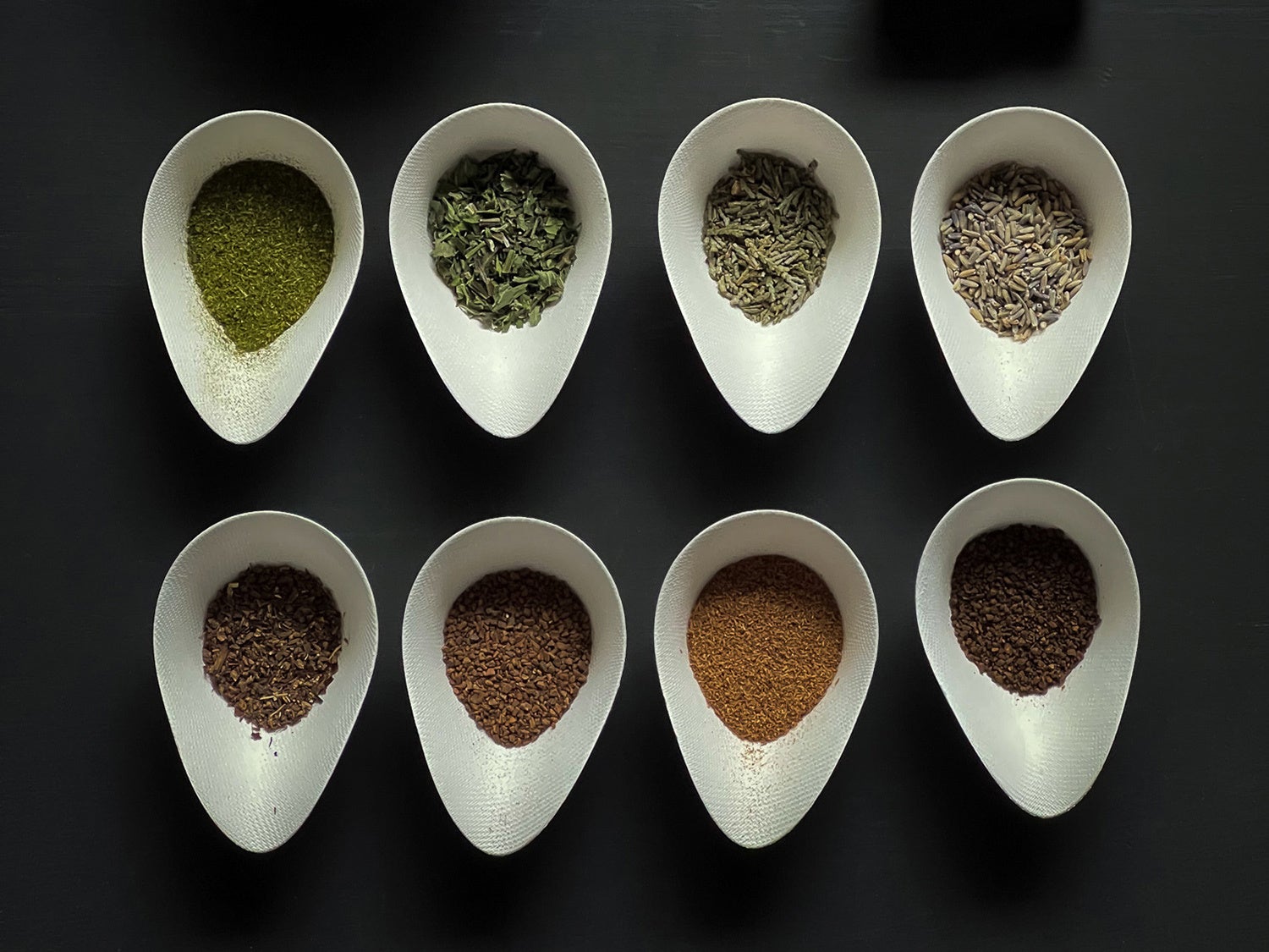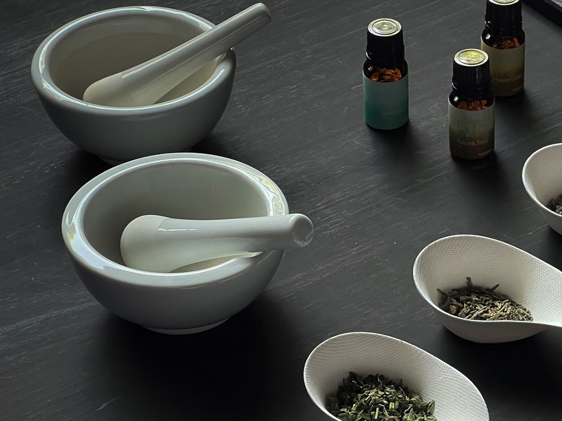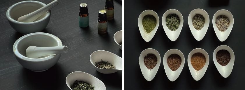 「Yohaku」のアイコンでもある4種のブレンドオイル。これらのオイルと、白檀、桂皮、ラベンダー、和ハッカなど、10種の天然の香原料を調香師が開発したレシピにのっとり掛け合わせフレグランスバッグ作りをお楽しみいただけます。お客様のお好みで原料の足し引きのアレンジも出来ます。香原料のなかには、茶の名産地である嬉野らしく、副島園産の煎茶「さえみどり」といった珍しいものも。