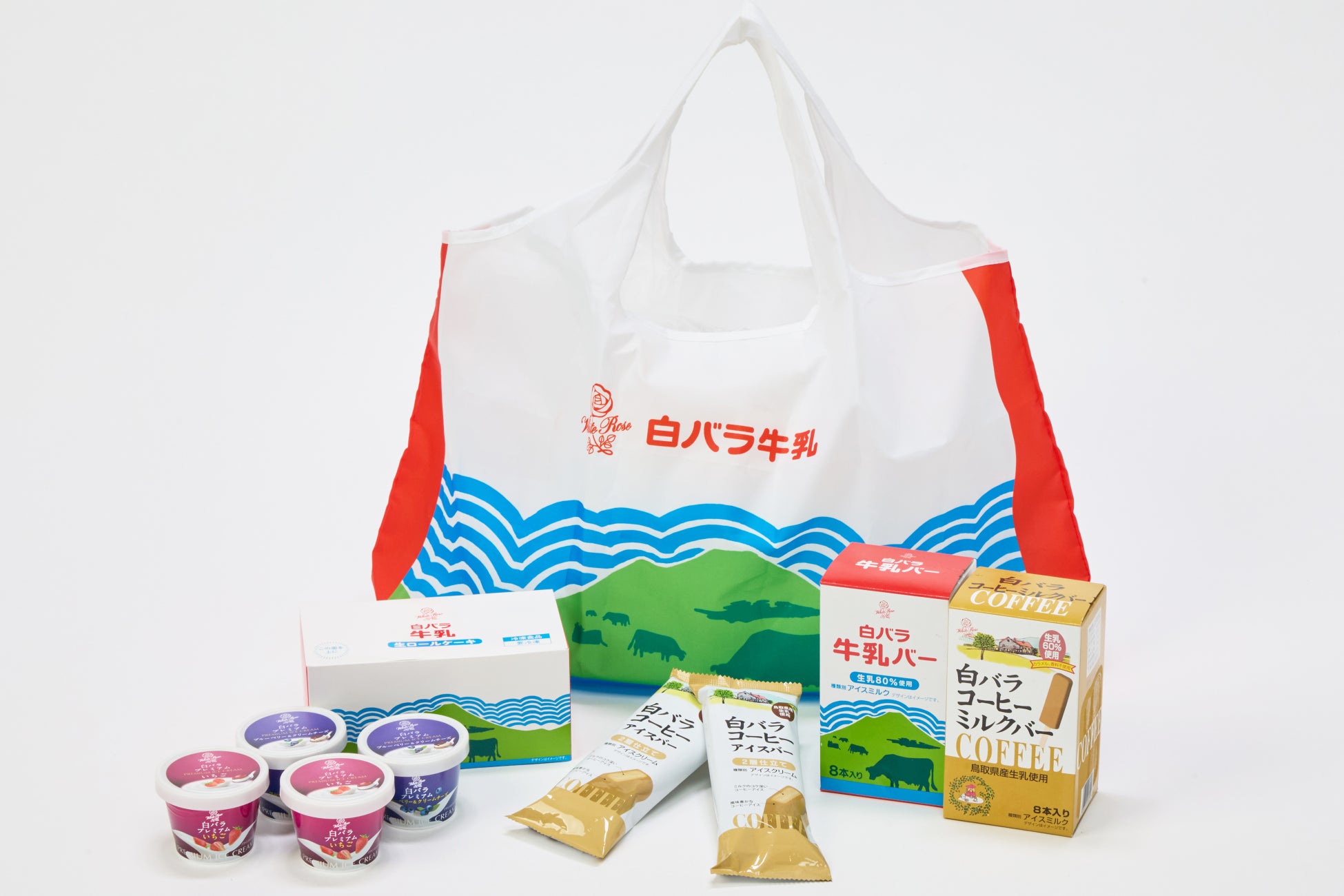 セット内容:白バラ牛乳エコバッグ×1個、白バラ牛乳生ロールケーキ×1個、白バラ牛乳バー(30ml×8本)×1個、白バラコーヒーミルクバー(30ml×8本)×1個、白バラプレミアム いちご95ml×2個、白バラプレミアム ブルーベリー&クリームチーズ95ml×2個、白バラコーヒーアイスバー2層仕立て80ml×2個