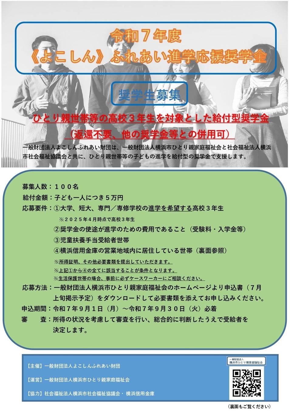 ひとり親世帯等の高校3年生の進学を応援する給付型の奨学金を支給します。令和7年度≪よこしん≫ふれあい応援奨学金(100名募集、申込期間:9月1日~9月30日まで)。