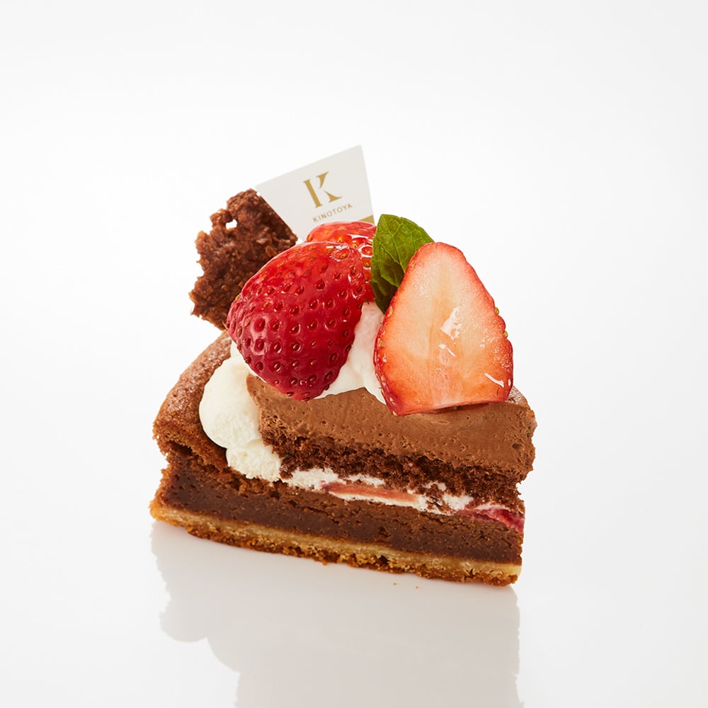 チョコレートムースとチョコレート風味のしっとりタルト生地で、生クリームとスライスイチゴをサンドし、クッキー生地に重ね、イチゴとサクッとしたチョコクランチで飾りました。