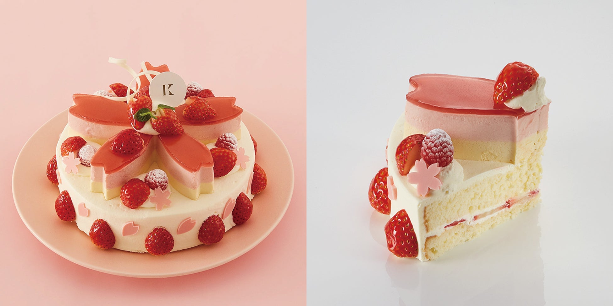 さくらの花びら型のイチゴムースは上にイチゴのゼリー、下にバニラババロアを重ねた3層の贅沢な味わい。